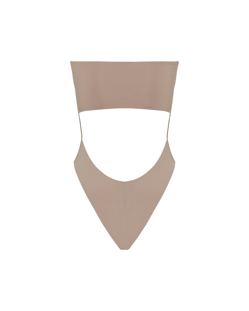 The Aloe Strapless One Piece features a high cut leg, back cut out feature and mid coverage bottom.