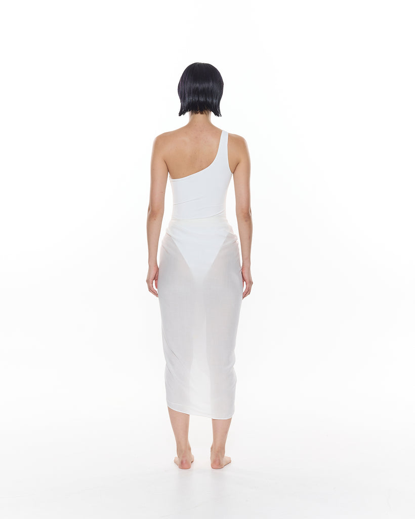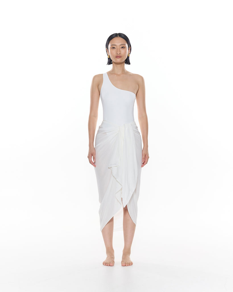 The Dexter Sarong is a versatile multi-use garment that can be tied to the side like a classic sarong or above the bust to cover mid-body section.