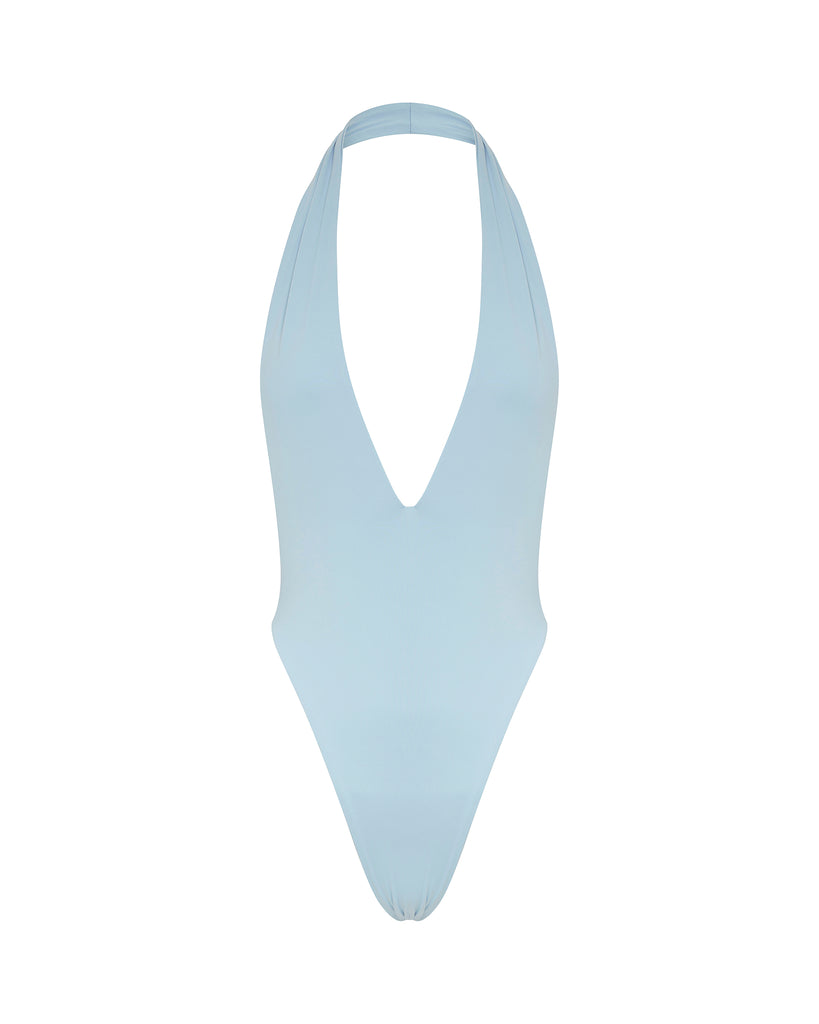 The Ralph Deep Plunge One Piece features a halter v neckline, open back and minimal coverage bottom.