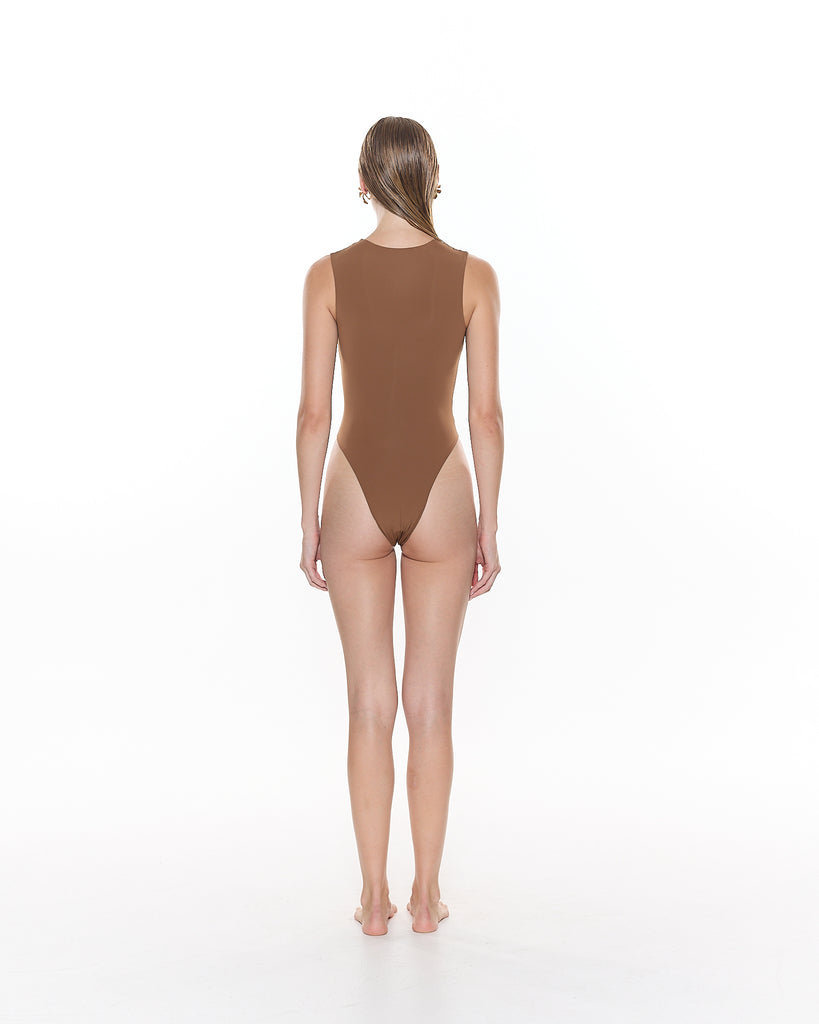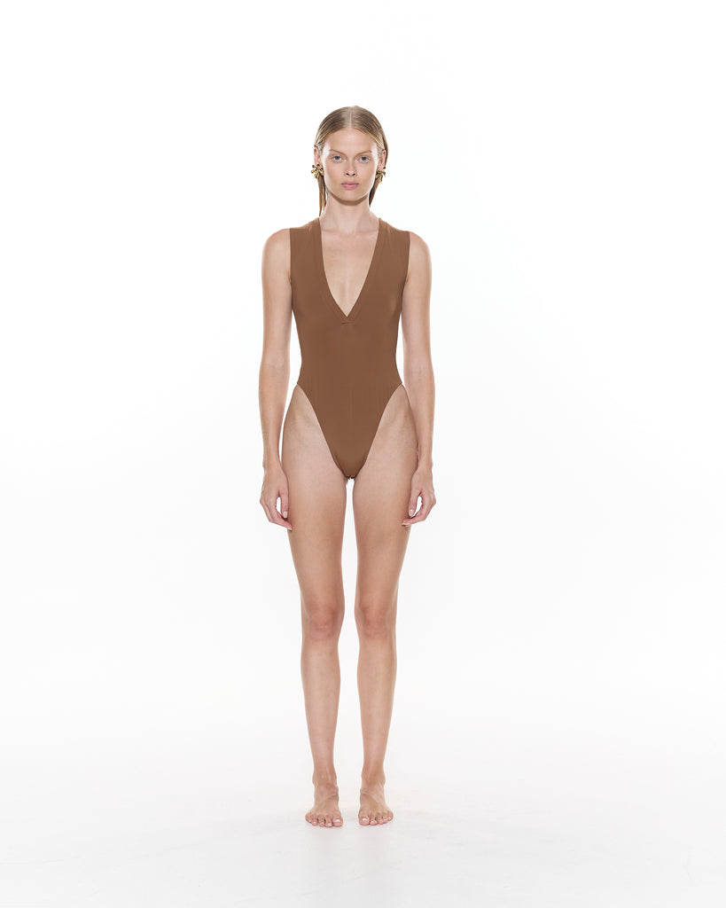 The Luca One Piece features a deep, accentuating V front, complimented by a full coverage back and a medium coverage bottom.