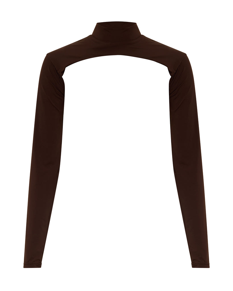 The Brock Long Sleeve Bikini Top features a high neckline and open front and back detail. Pair this style with any bikini top or one piece for an elevated bolero look.
