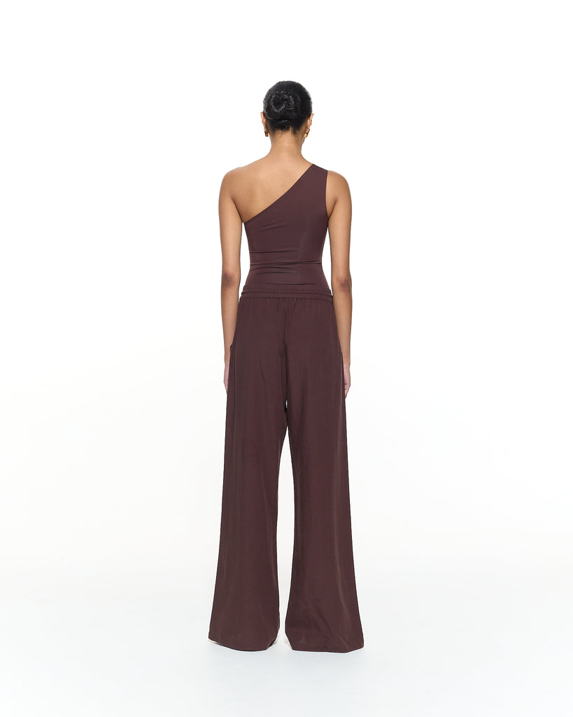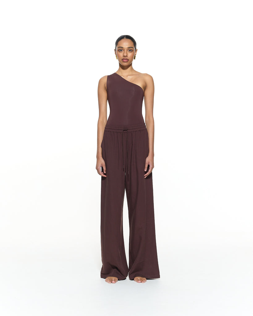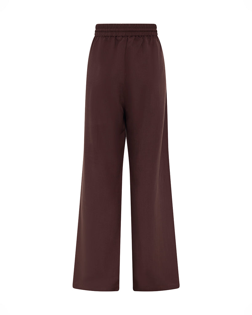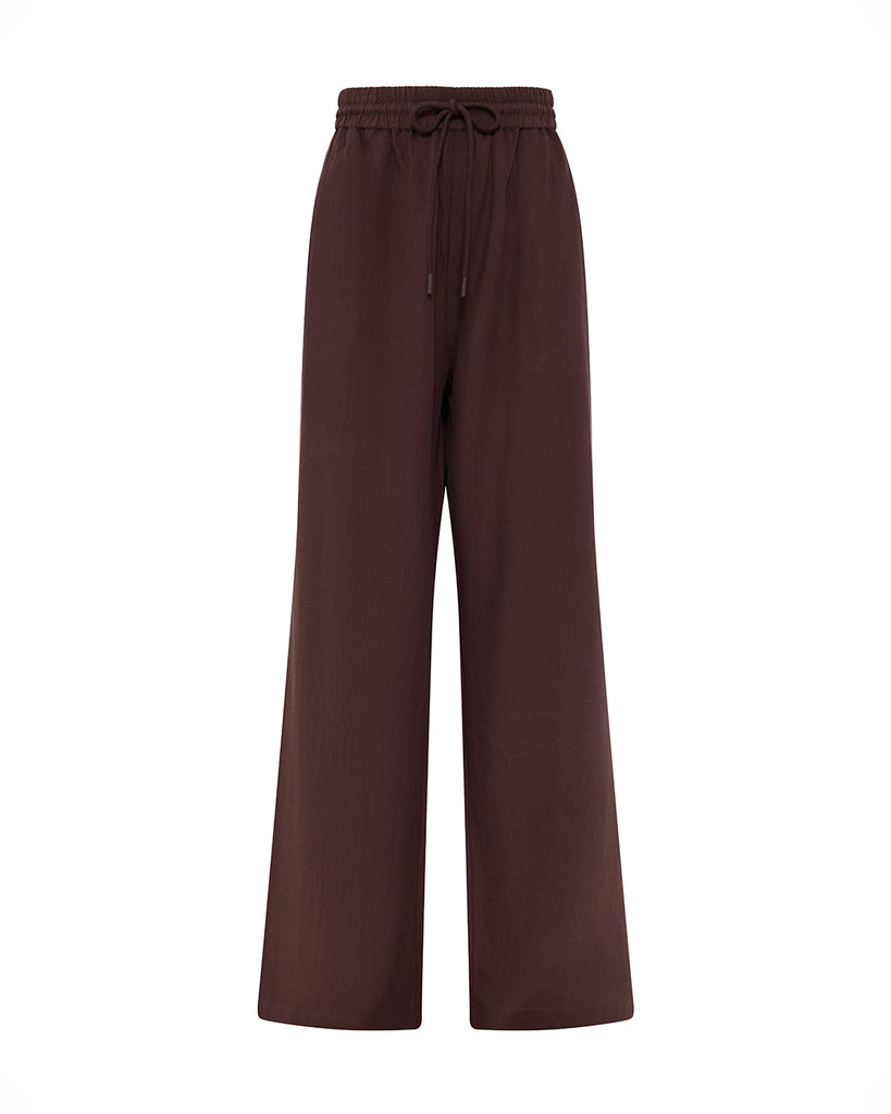 The Dalton Drawstring Linen Pant features a wide leg, dual pockets and tie-waist feature.