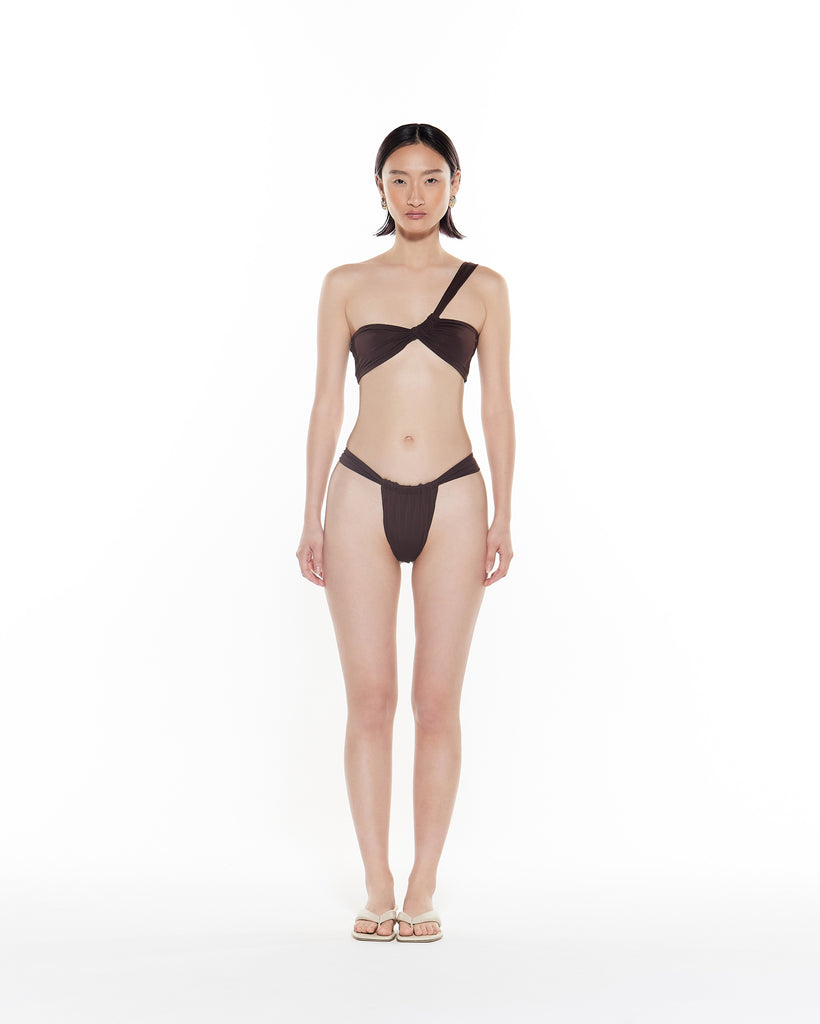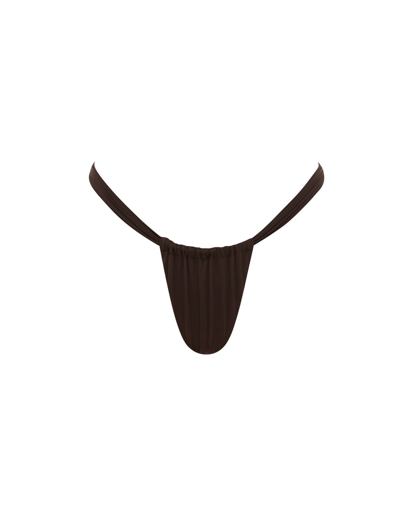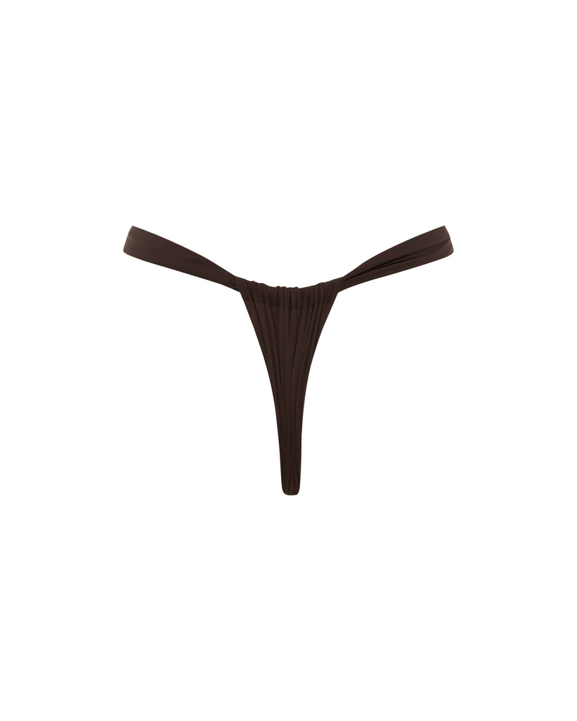 The Rio Ruched Thong Bikini Bottom features fixed sides and adjustable front and back coverage.