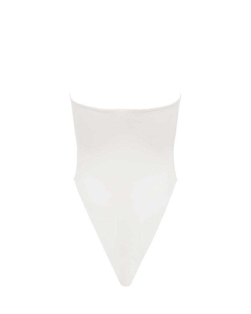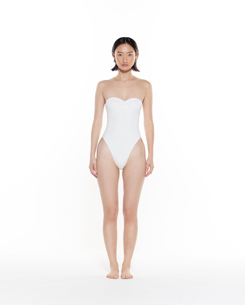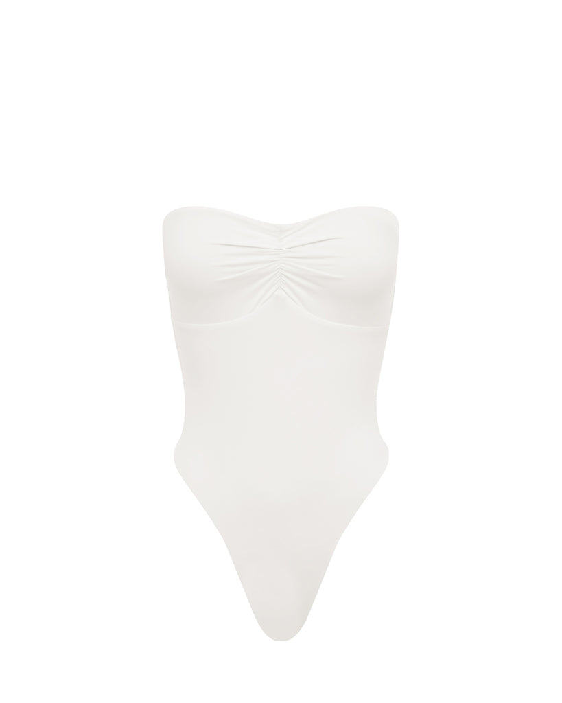 The Kelly Strapless One Piece features a gathered bust detail, high leg cut and medium coverage bottom.