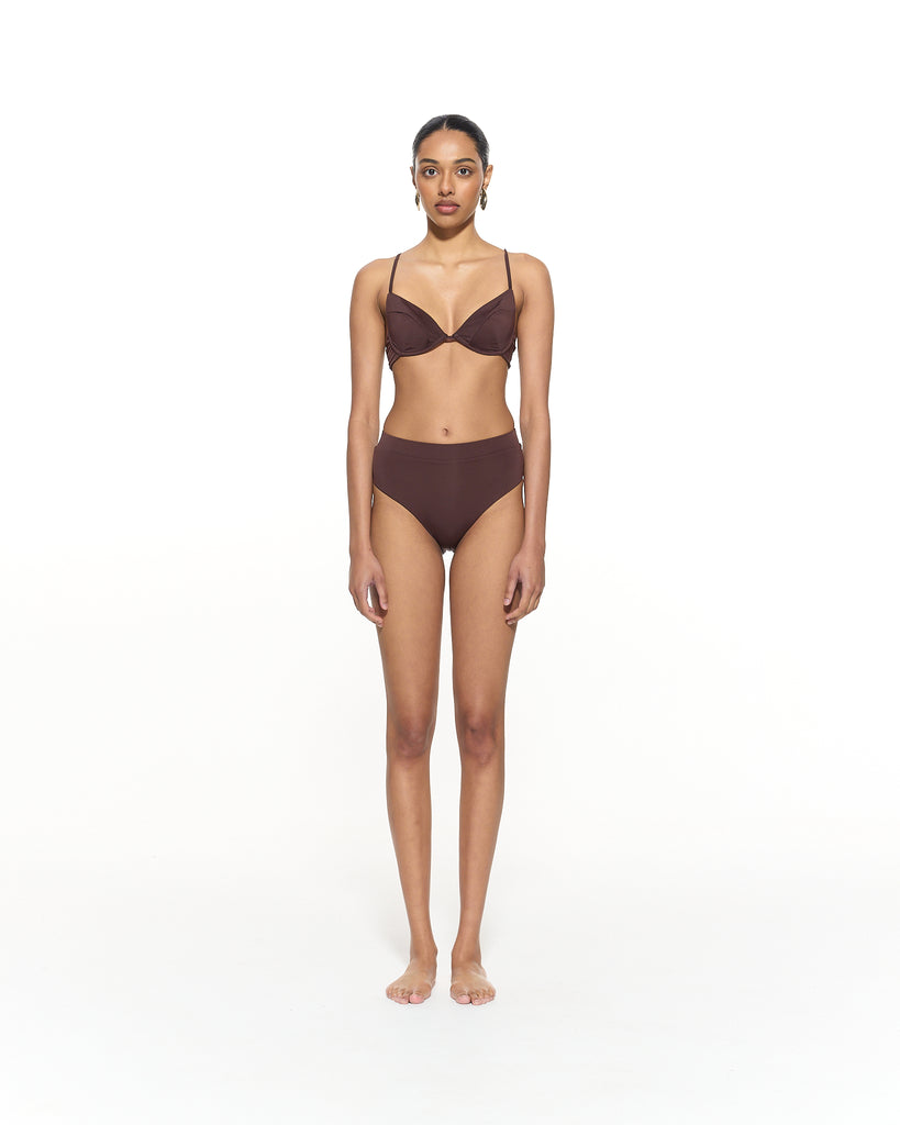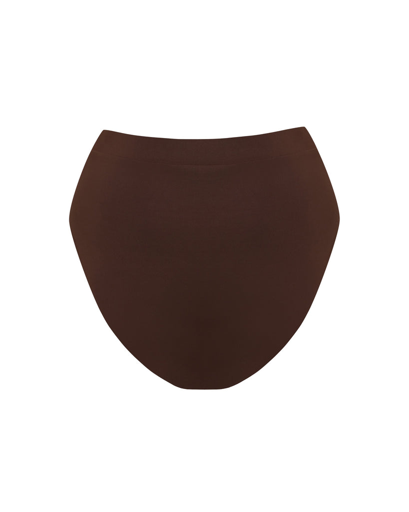 The Hugo High Waist Bikini Bottom features an elastic waistband and full coverage bottom.