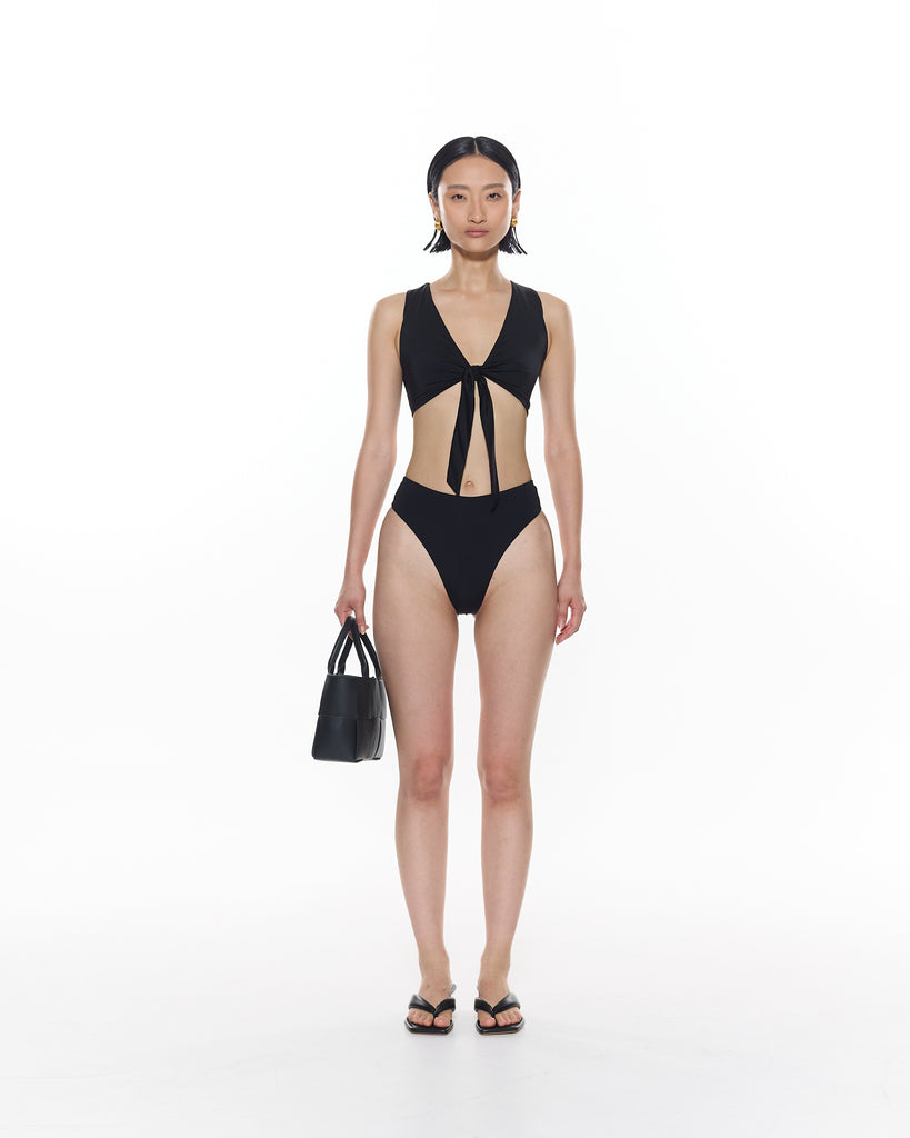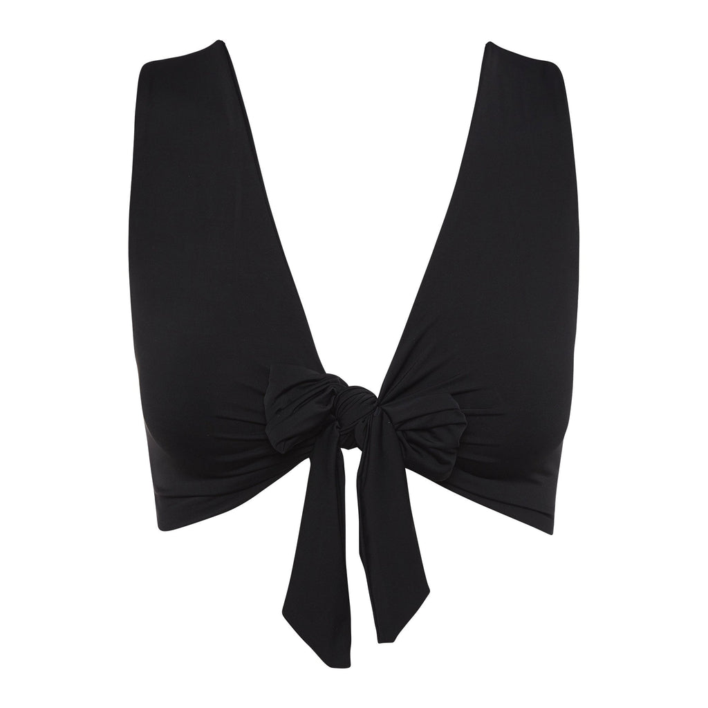 The West Tie-Front Bikini Top features a v-neckline and adjustable front tie detail.
