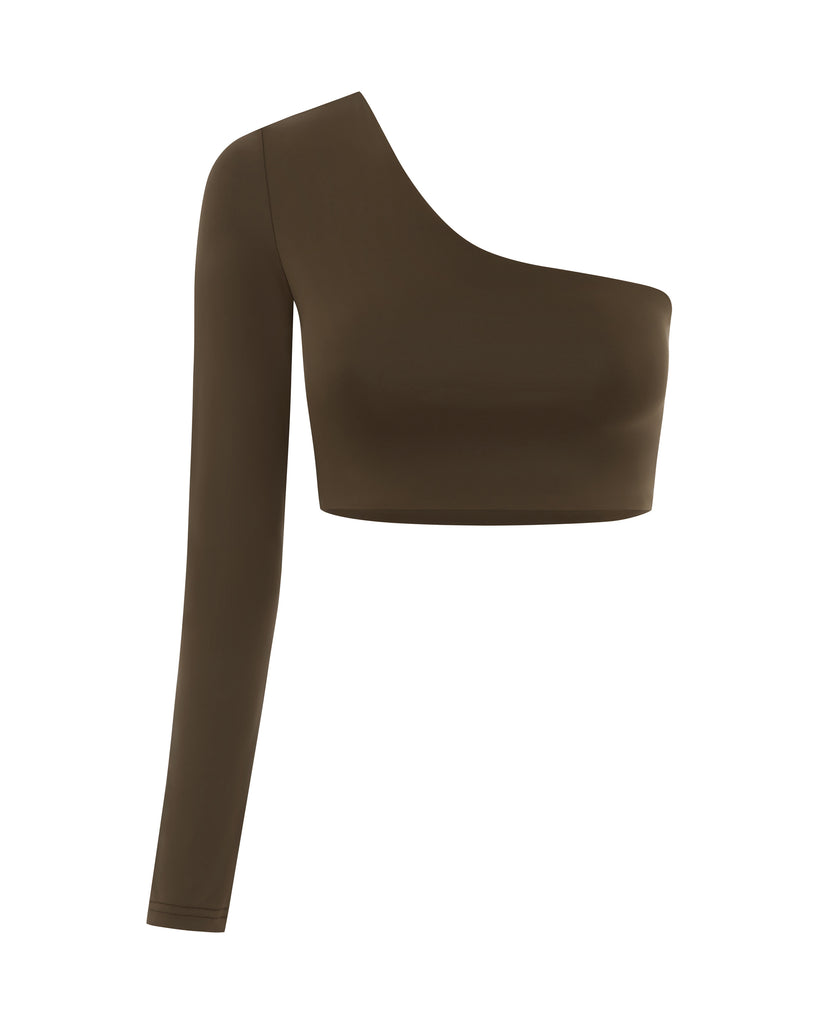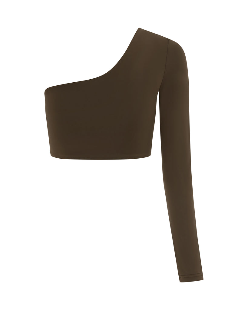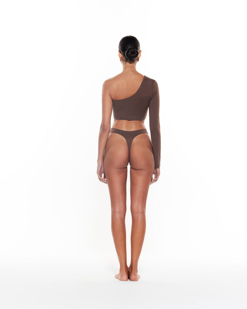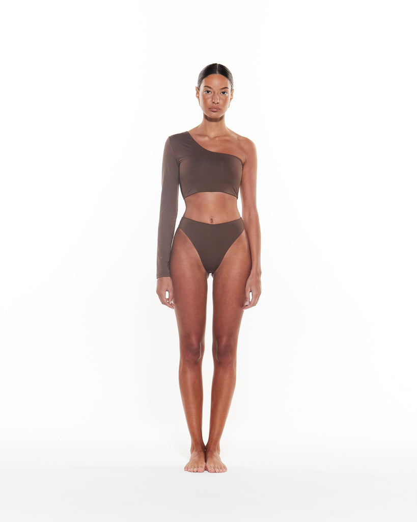 The Alonzo Asymmetrical Bikini Top features a one-shoulder long sleeve detail.