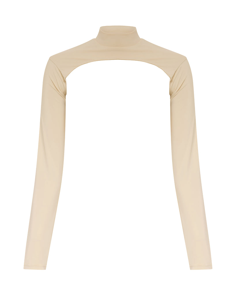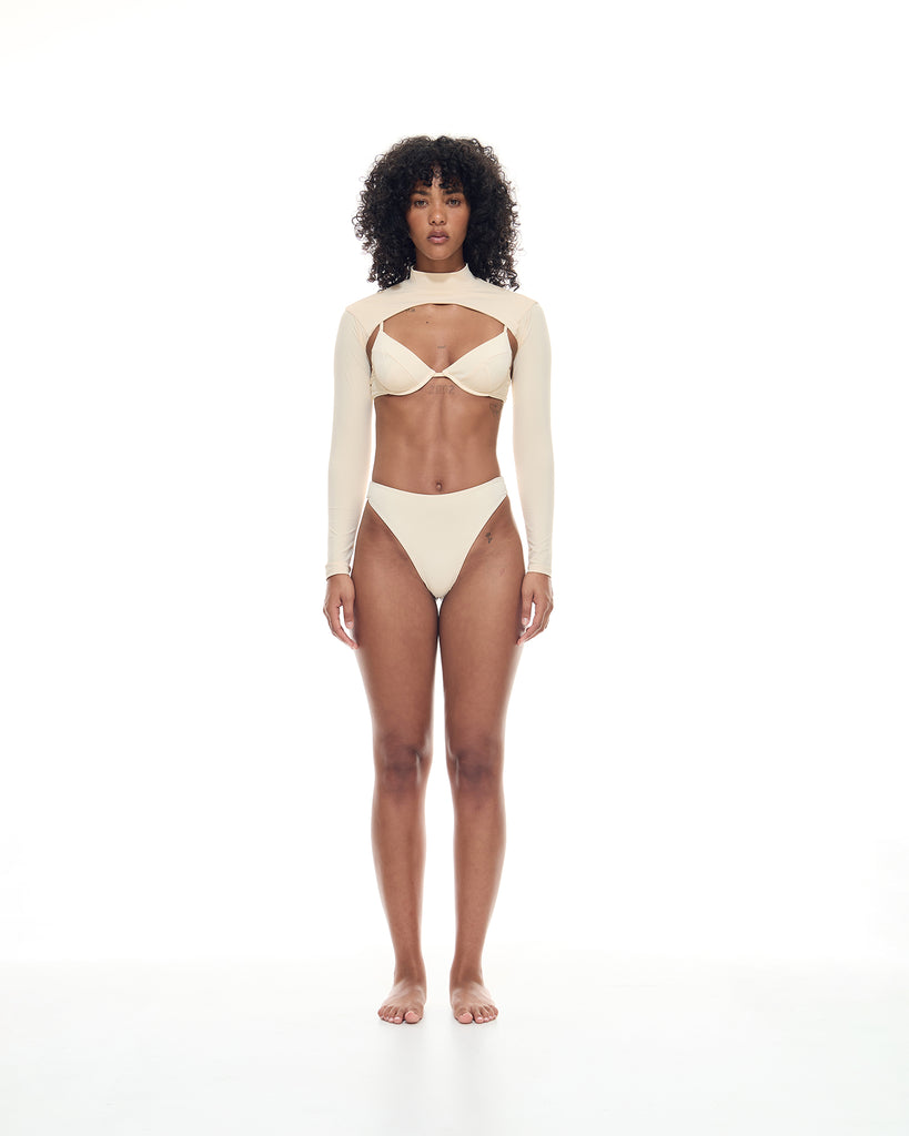 The Brock Long Sleeve Bikini Top features a high neckline and open front and back detail. Pair this style with any bikini top or one piece for an elevated bolero look.