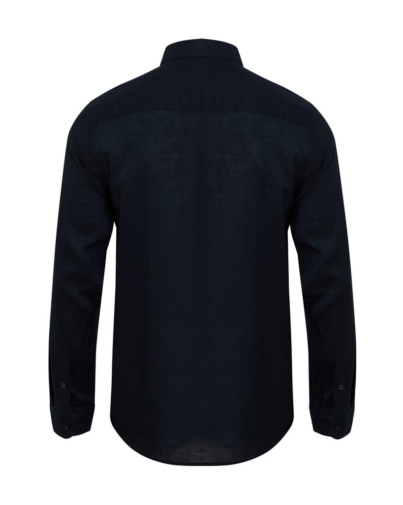 The Harlem Long Sleeve Linen Shirt features a button-up front, pressed collar and single pocket.