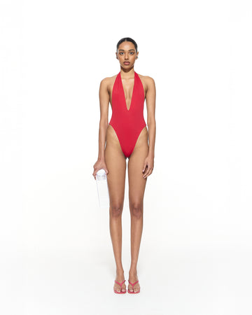 The Ralph Deep Plunge One Piece features a halter v neckline, open back and minimal coverage bottom.