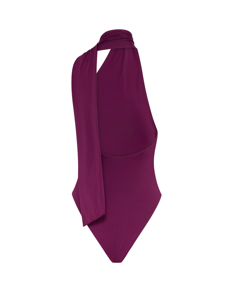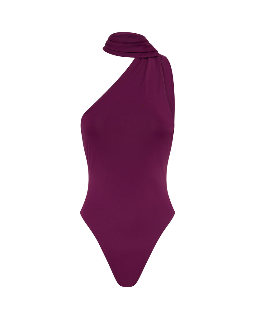 The Thorne Asymmetric One Piece features an adjustable wrap-around neck detail and medium coverage bottom.