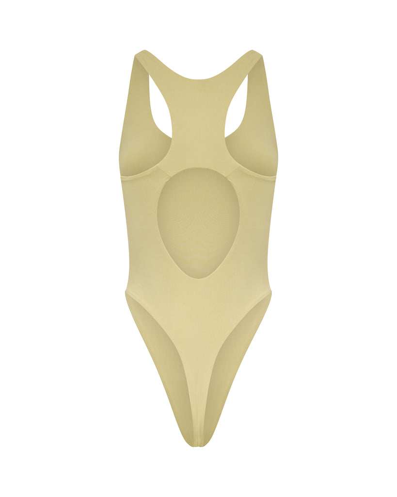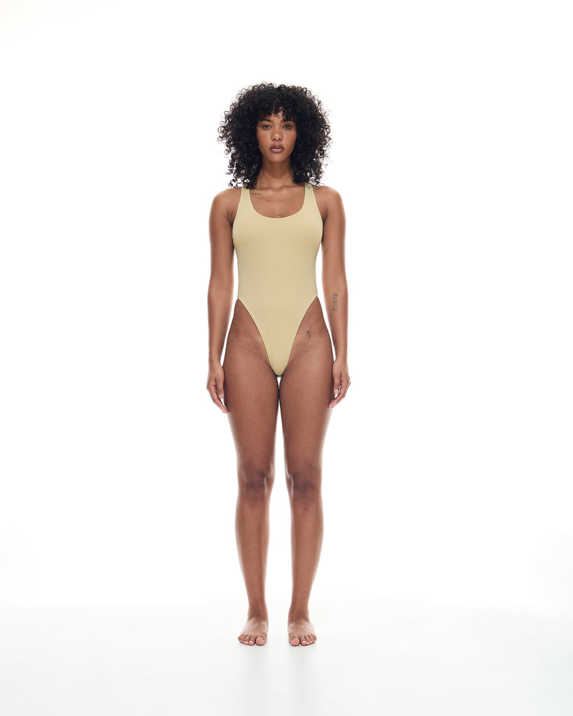 The Vae Scoop Neck One Piece features a high leg cut, racer-back detail and thong coverage bottom.