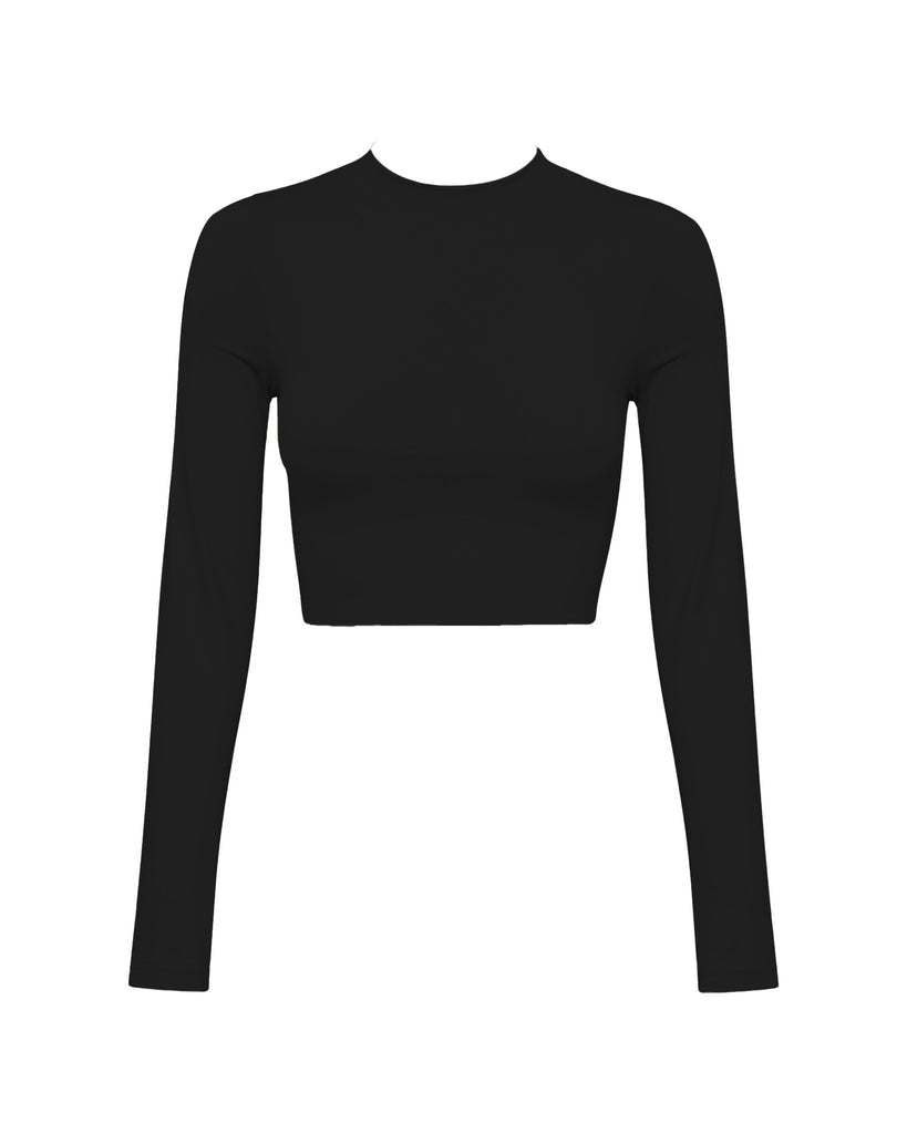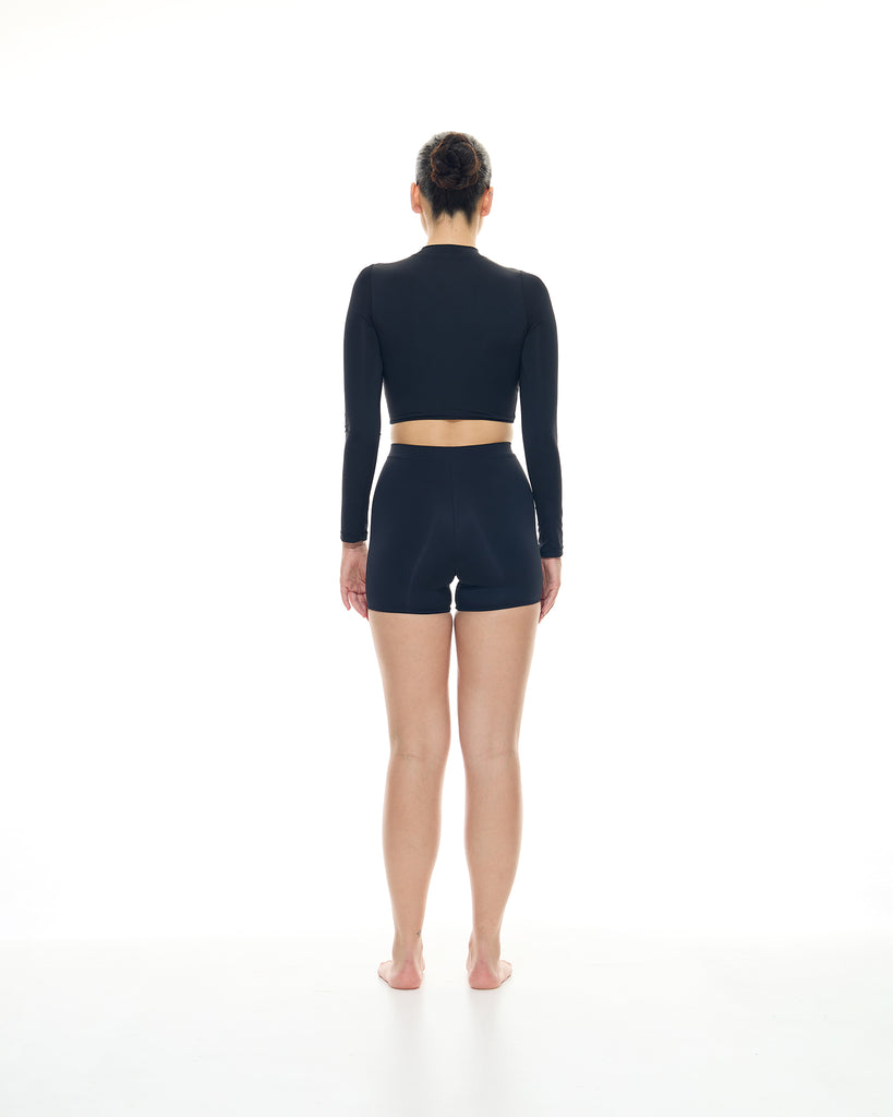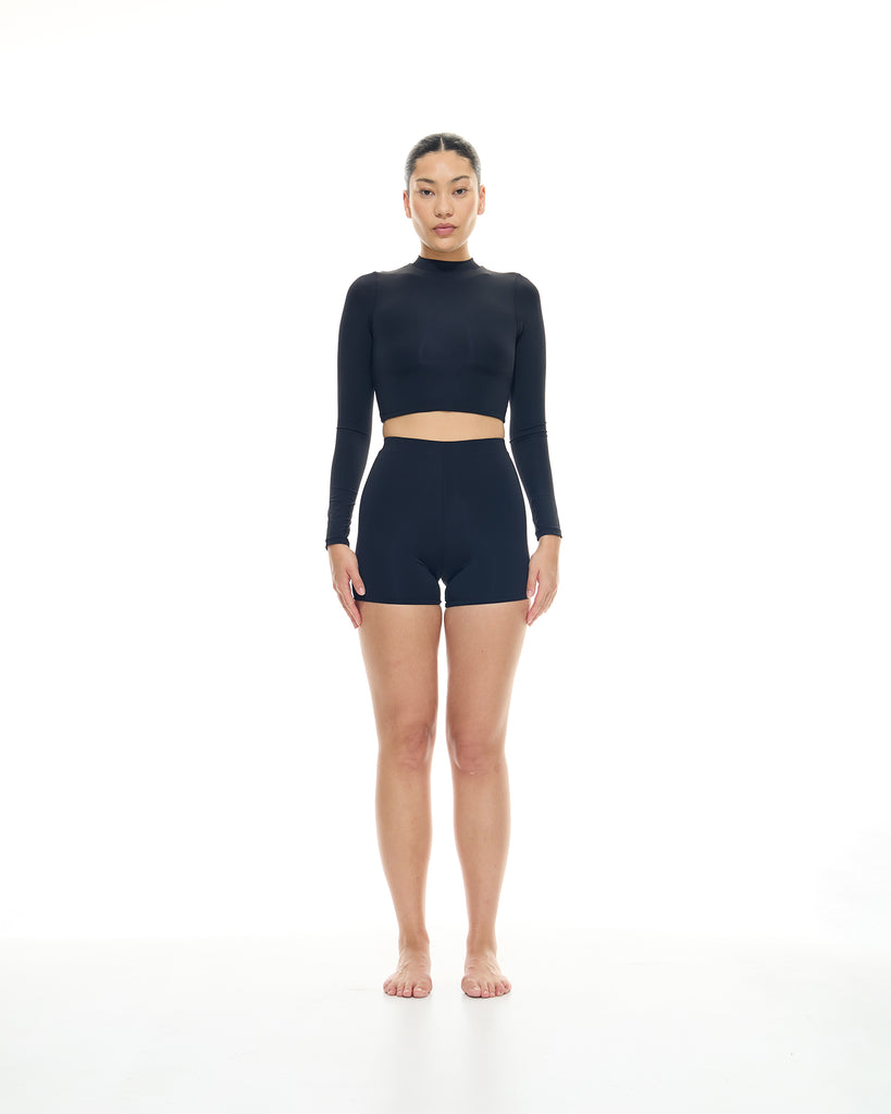 The Zion Long Sleeve Bikini Top is a simple style featuring a high neckline and cropped length.
