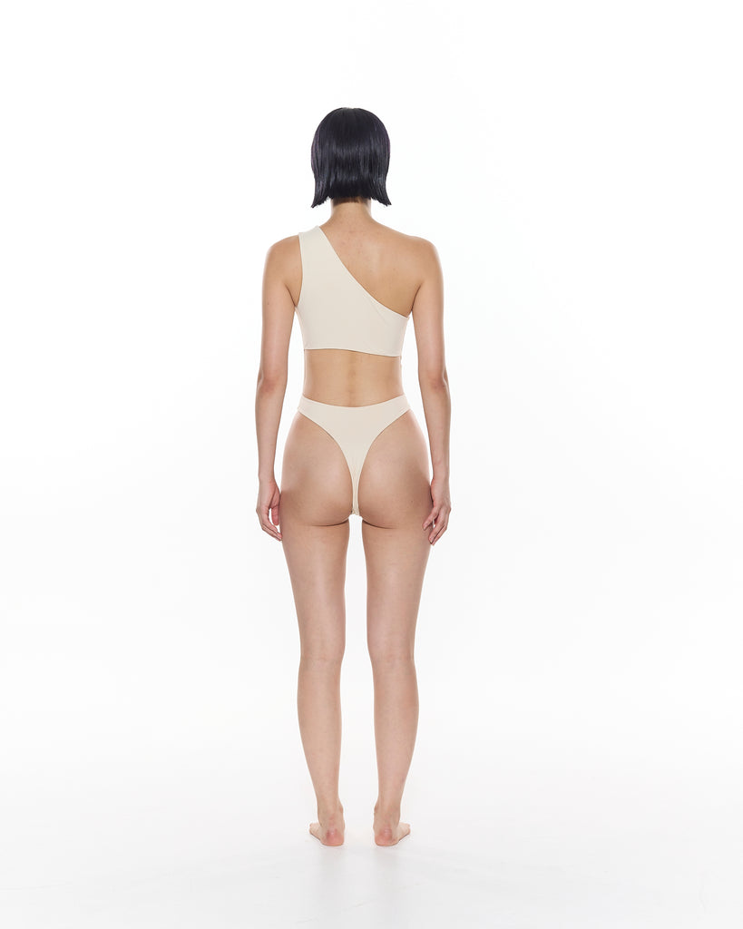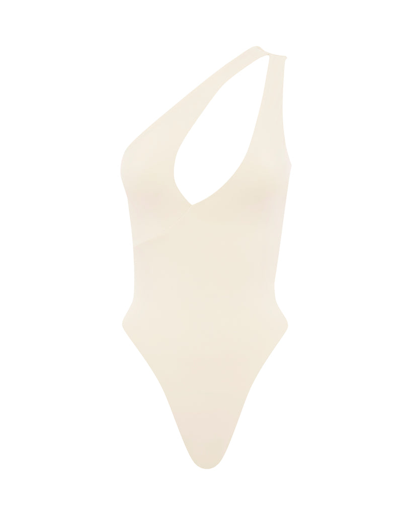 The Jett Asymmetric One Piece features a shoulder cut-out, high leg cut and thong bottom.