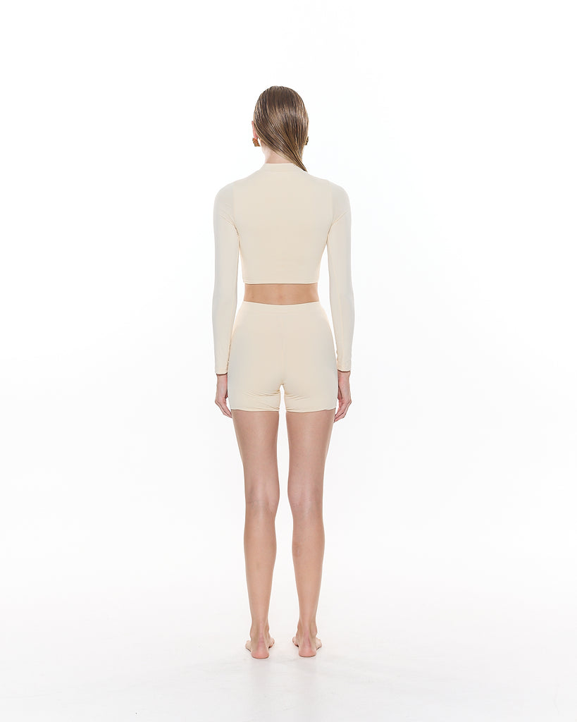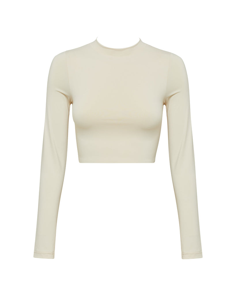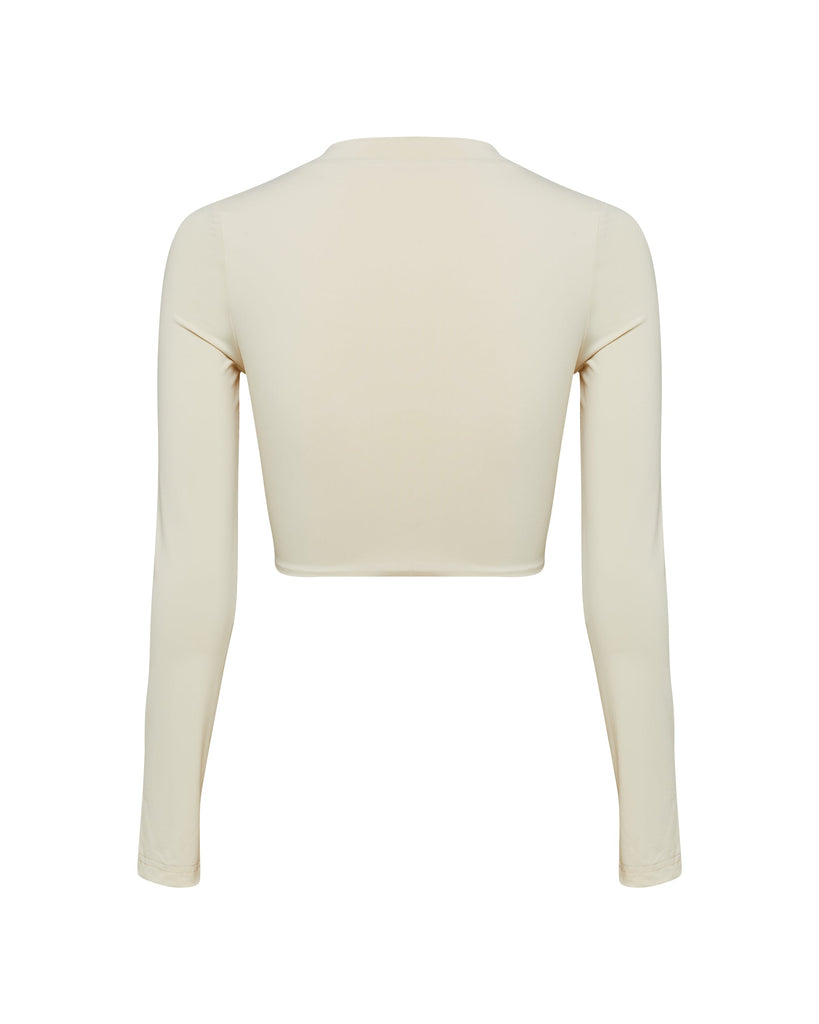 The Zion Long Sleeve Bikini Top is a simple style featuring a high neckline and cropped length.
