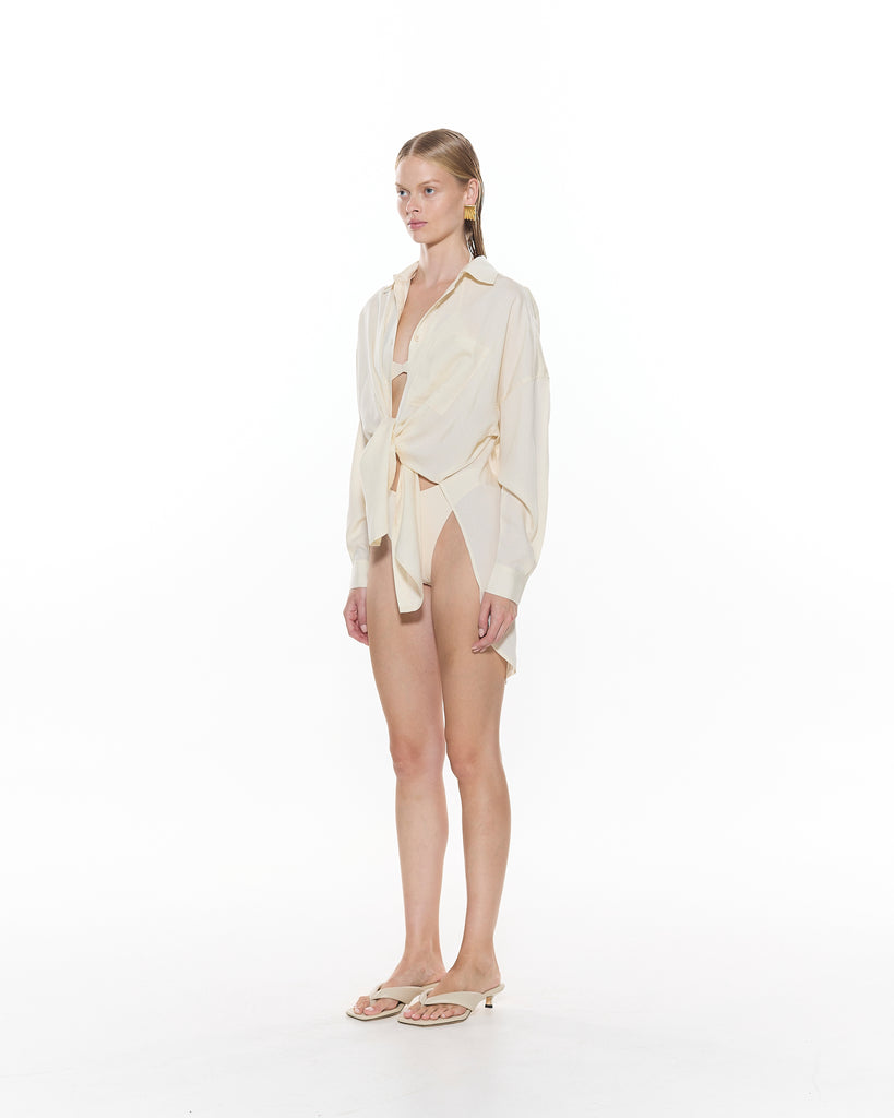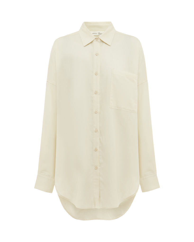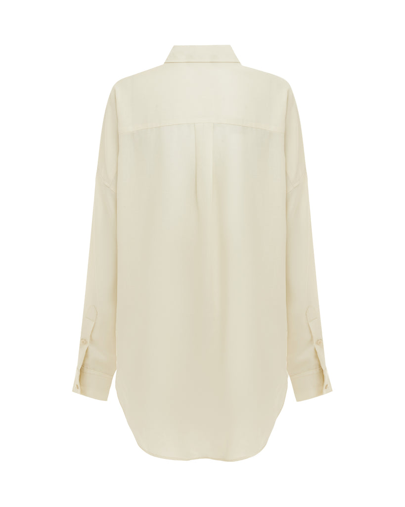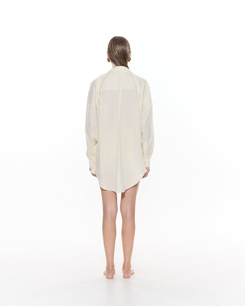 The Cruz Linen Shirt features long sleeves, a scooped back and custom logo buttons.