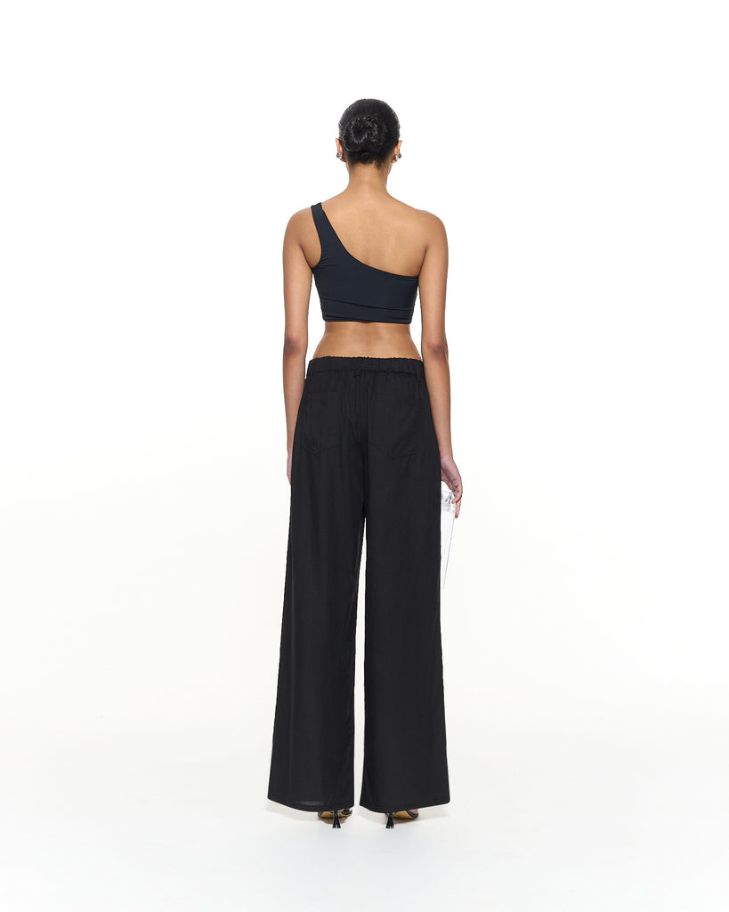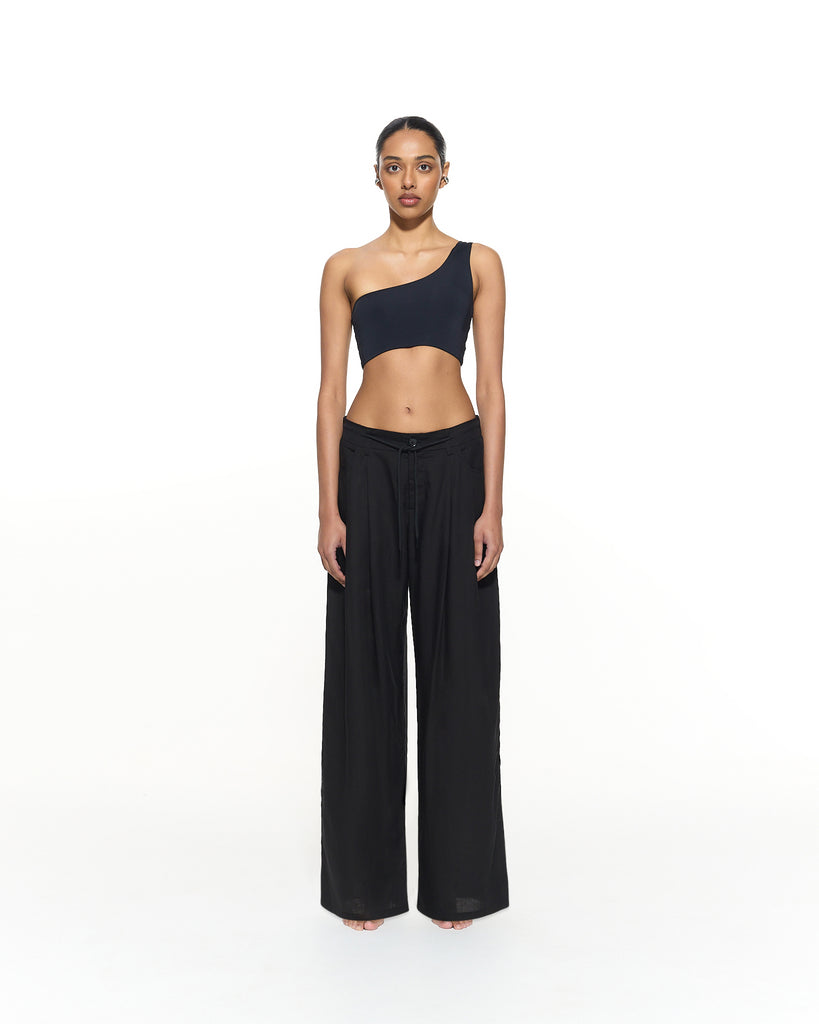 The Shai Drawstring Linen Pant features a flattering tie-waist feature, wide leg silhouette and functional cargo style pockets.