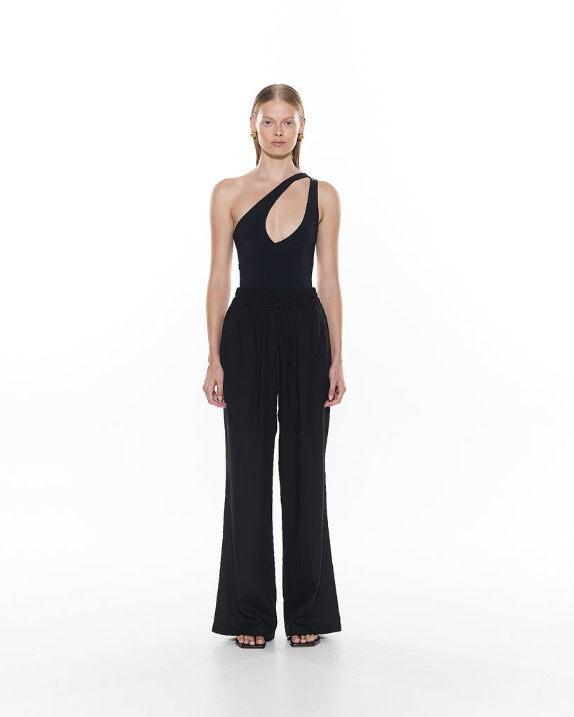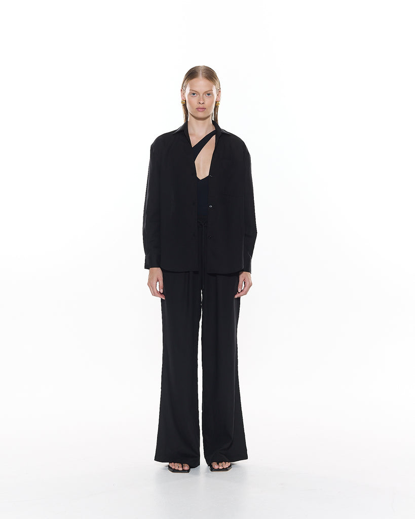 The Dalton Drawstring Linen Pant features a wide leg, dual pockets and tie-waist feature.