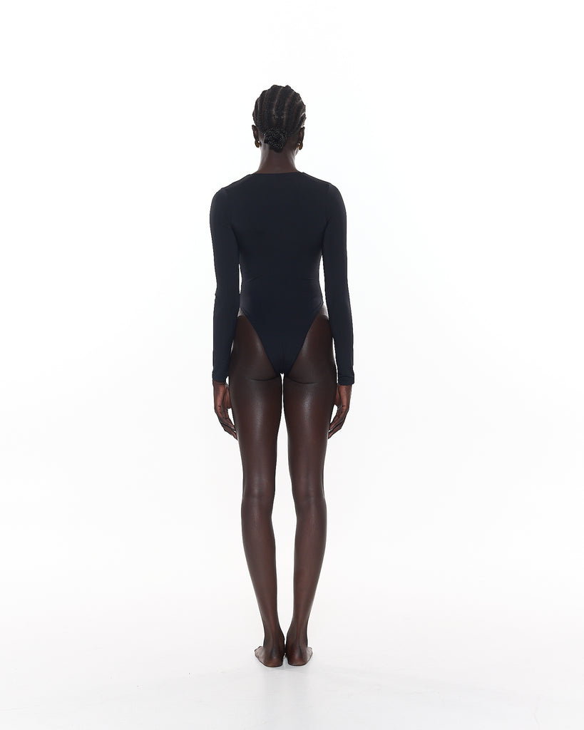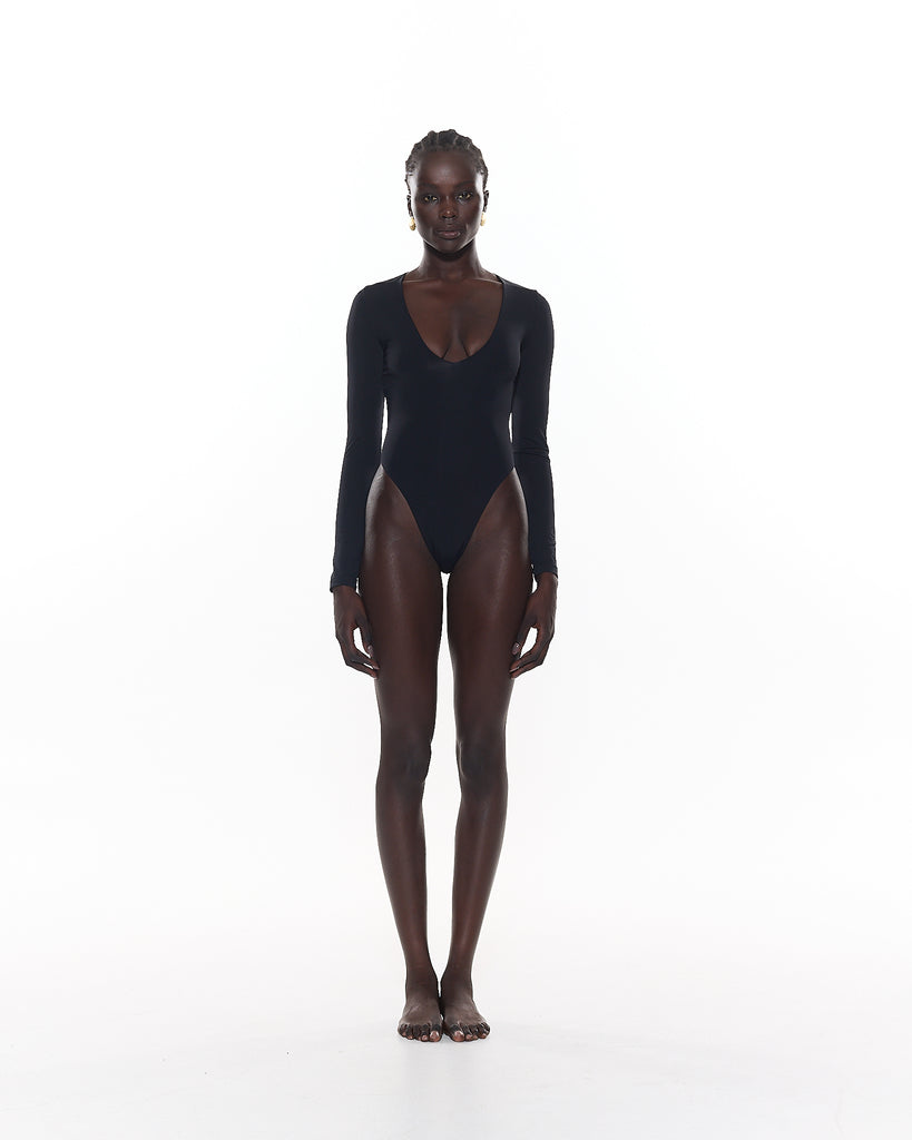 The Jag Long Sleeve One Piece features a scooped neckline, high leg cut and mid coverage bottom.