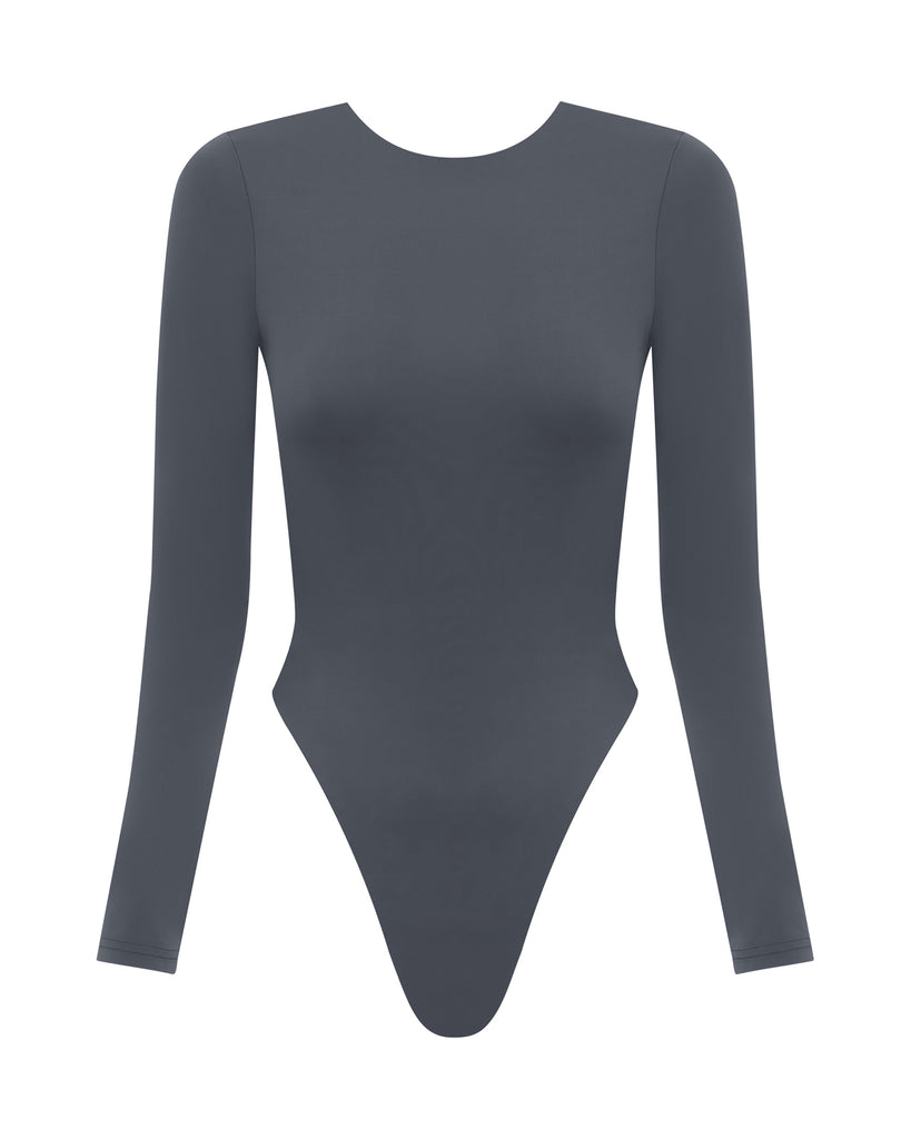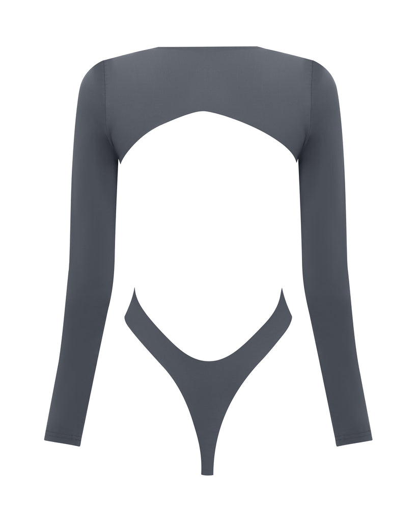 The Zuri Long Sleeve One Piece features a high leg cut, open back and thong coverage bottom.