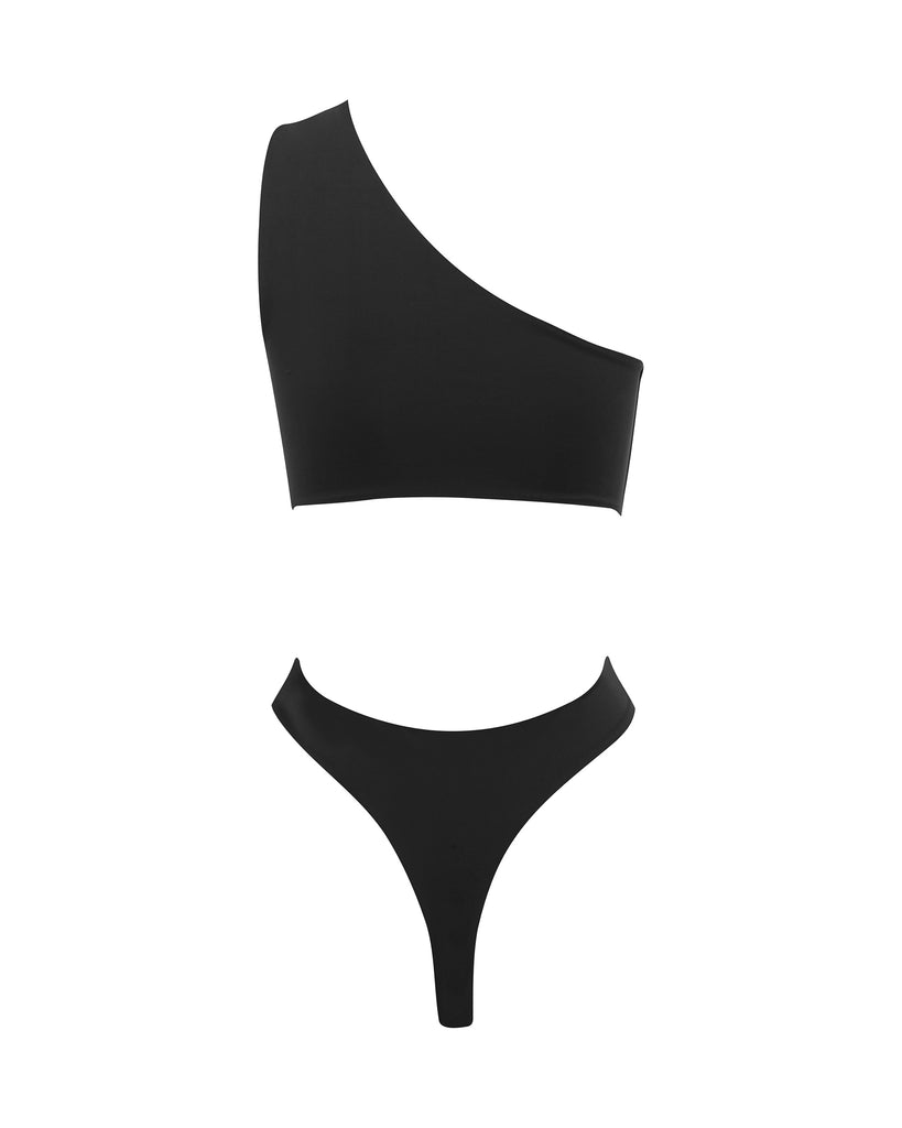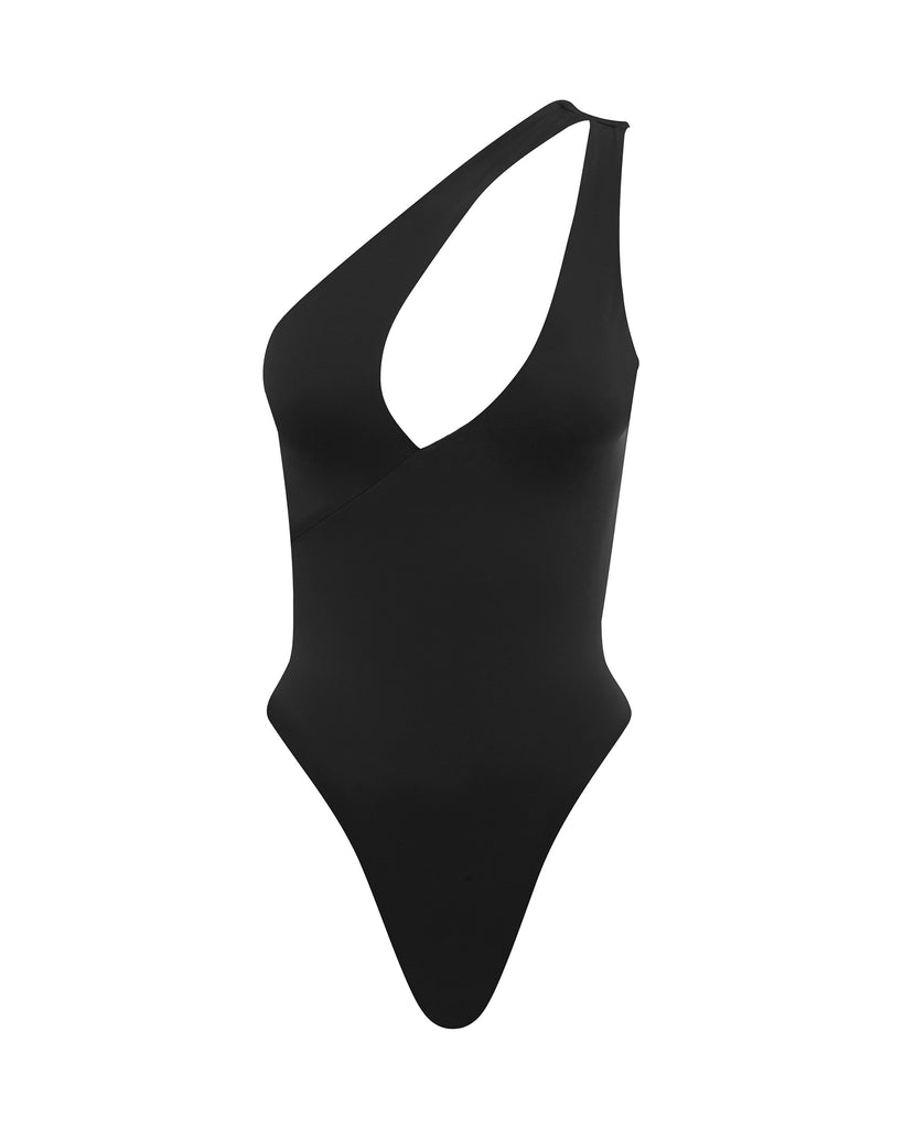The Jett Asymmetric One Piece features a shoulder cut-out, high leg cut and thong bottom.