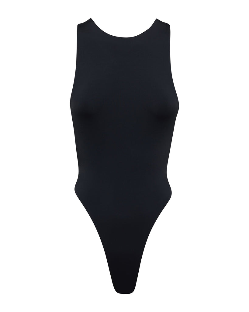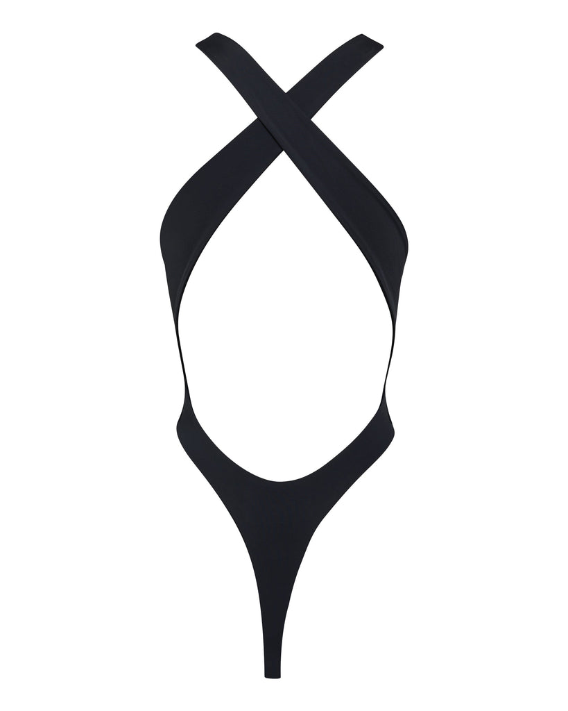The Amith High Neck One Piece features a high cut leg, cross-back detail and thong bottom.