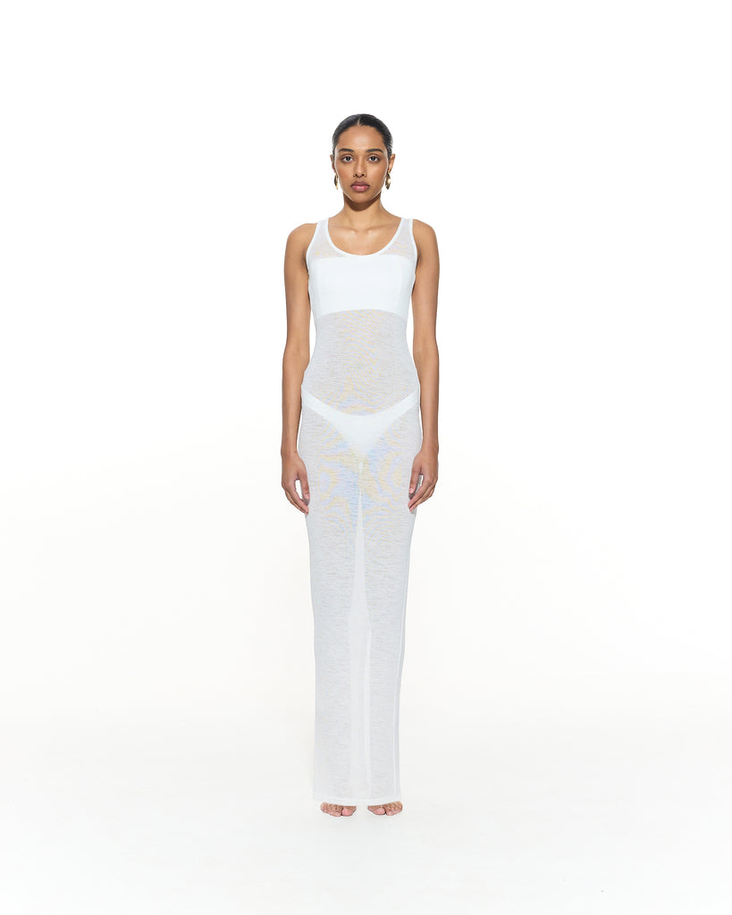 The Leena Sheer Maxi Dress is a lightweight, breathable style designed to layer over your favorite swim. Take this look from day to night with statement earrings, a bold clutch and heel!