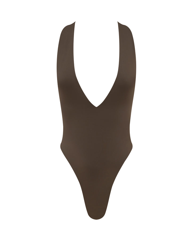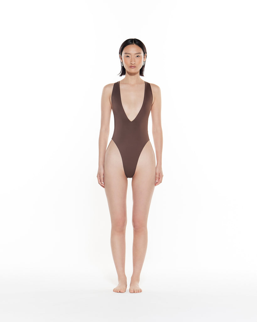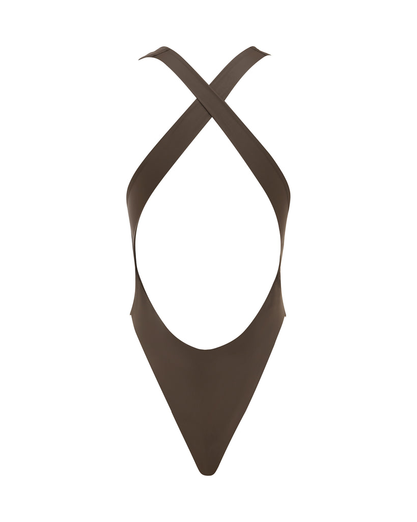 The Hunter One Piece features a deep v neckline, sporty cross back detail and high leg cut.