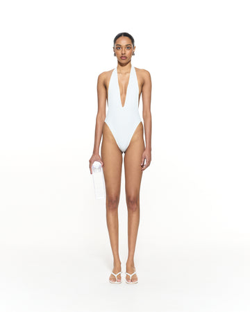 The Ralph Deep Plunge One Piece features a halter v neckline, open back and minimal coverage bottom.