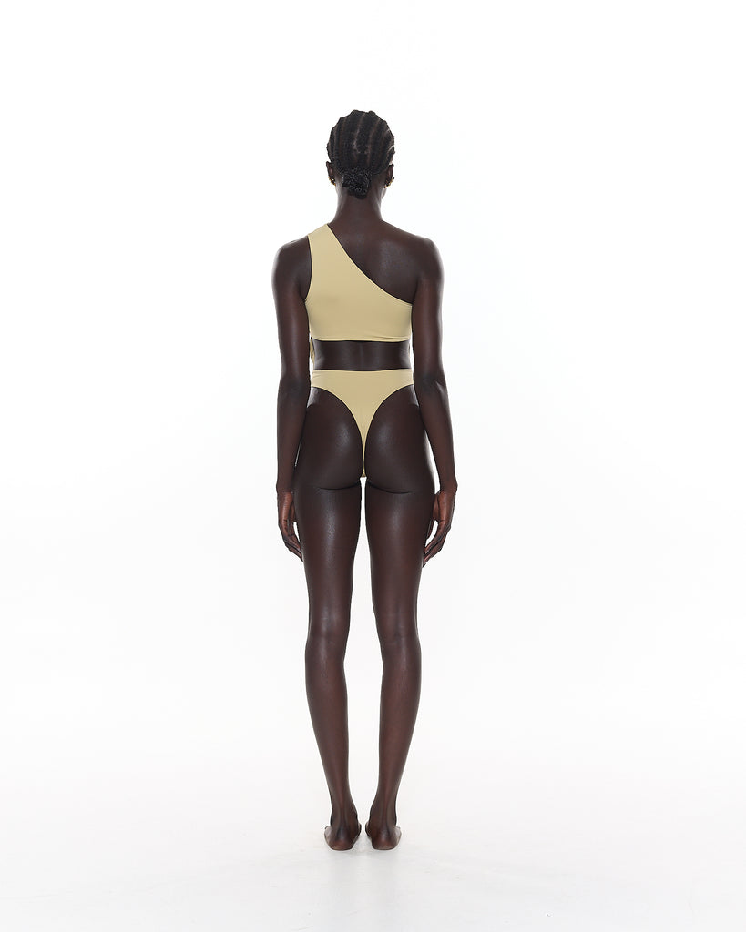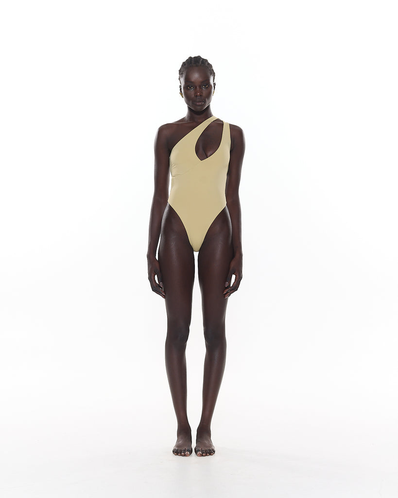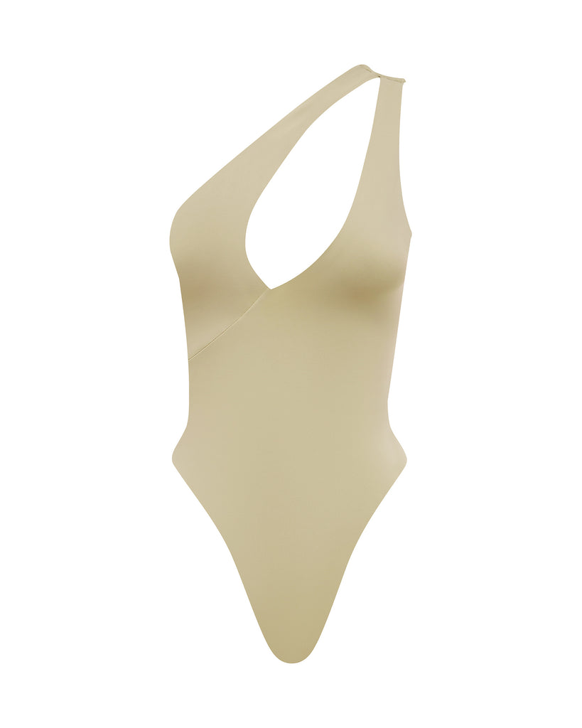 The Jett Asymmetric One Piece features a shoulder cut-out, high leg cut and thong bottom.