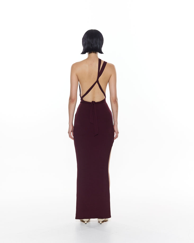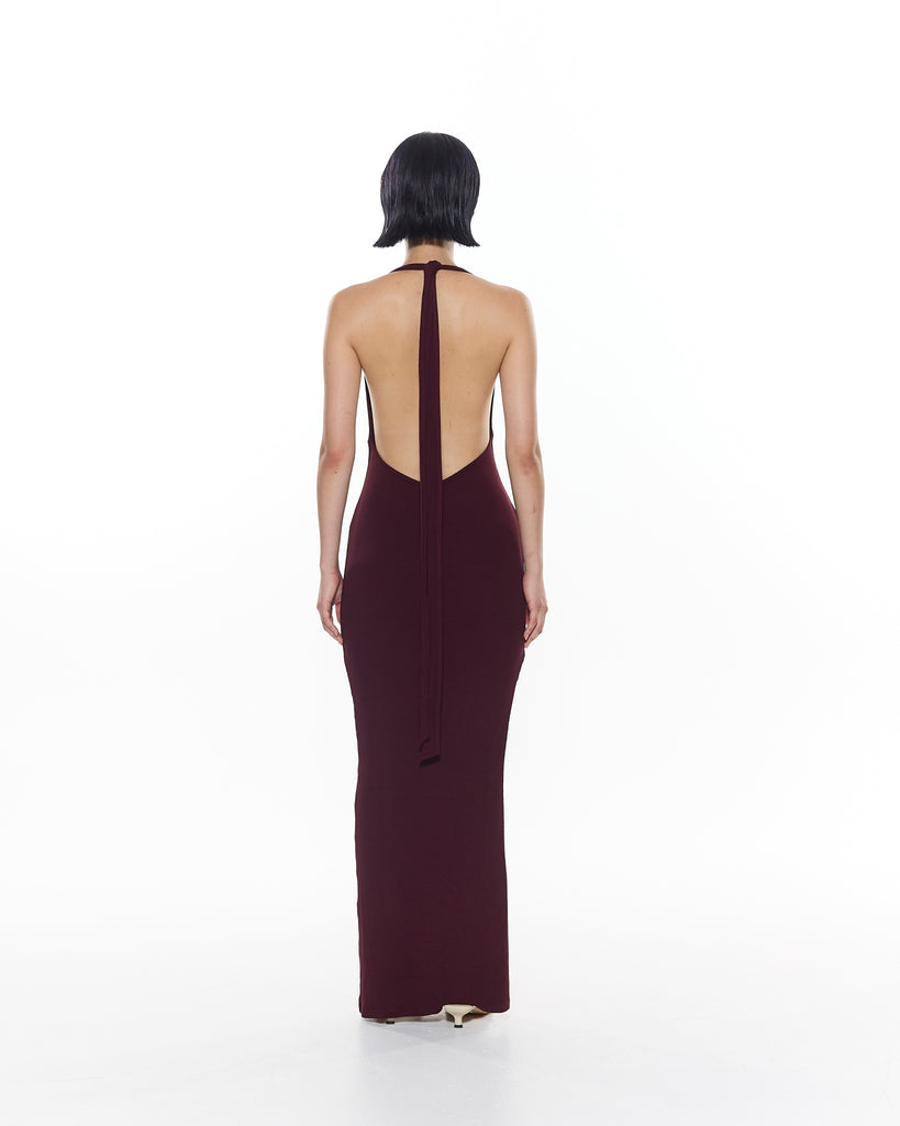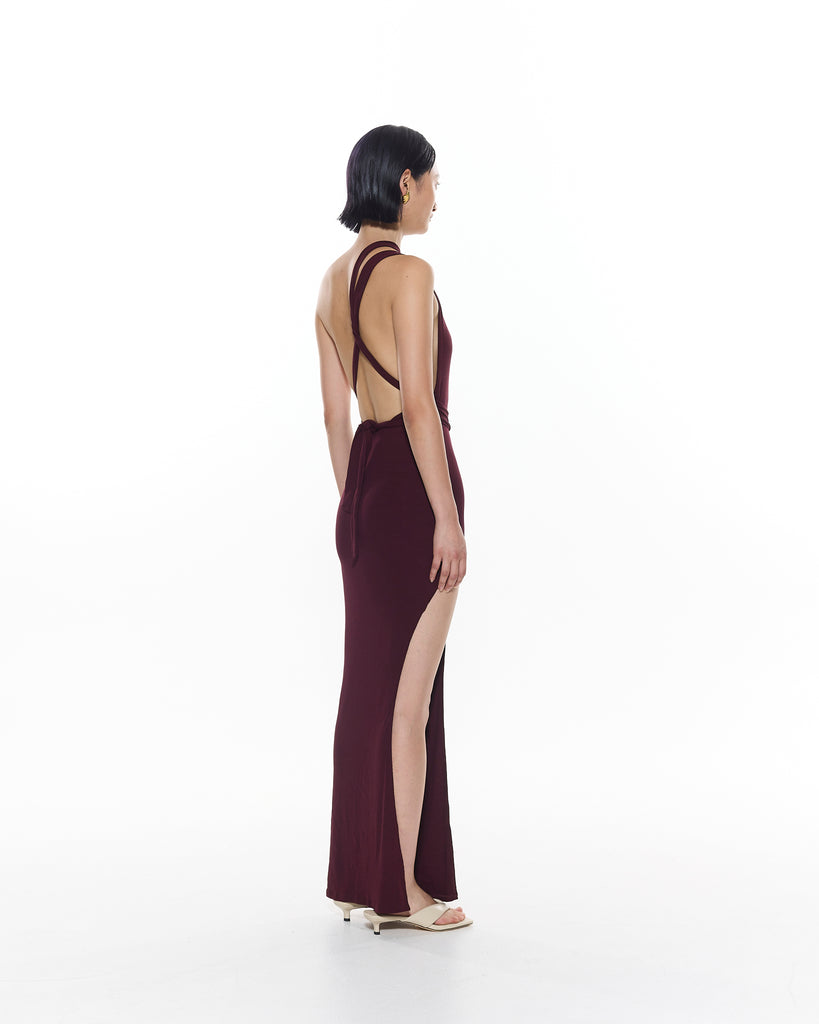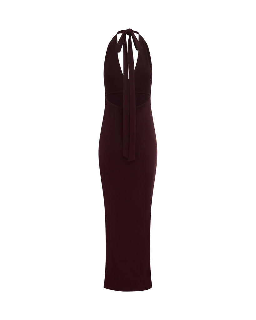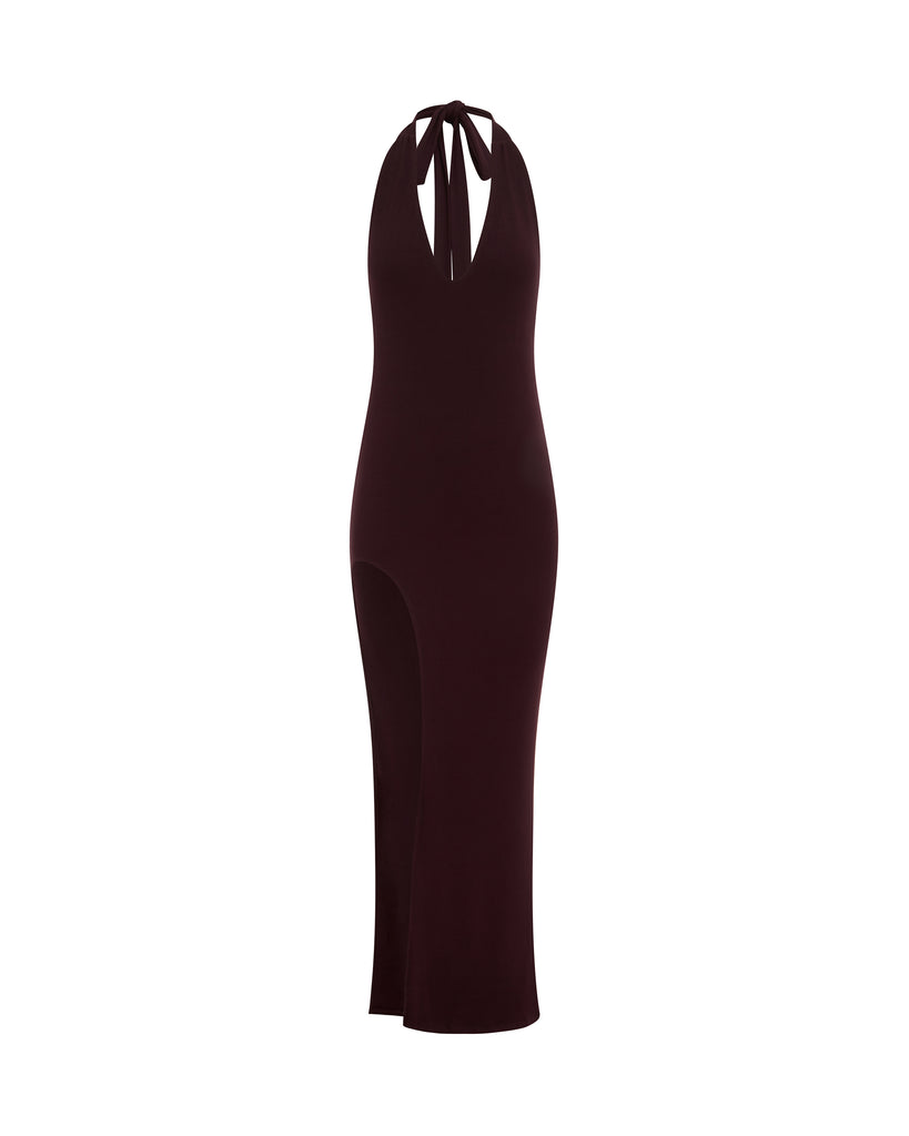 Crafted from our signature stretchy ribbed fabric, the Ava Dress offers optimal comfort while sculpting your body for a flattering look. Featuring a low V-neck front, high-cut leg slit, and versatile long halter neck straps, this dress allows you to create various looks.