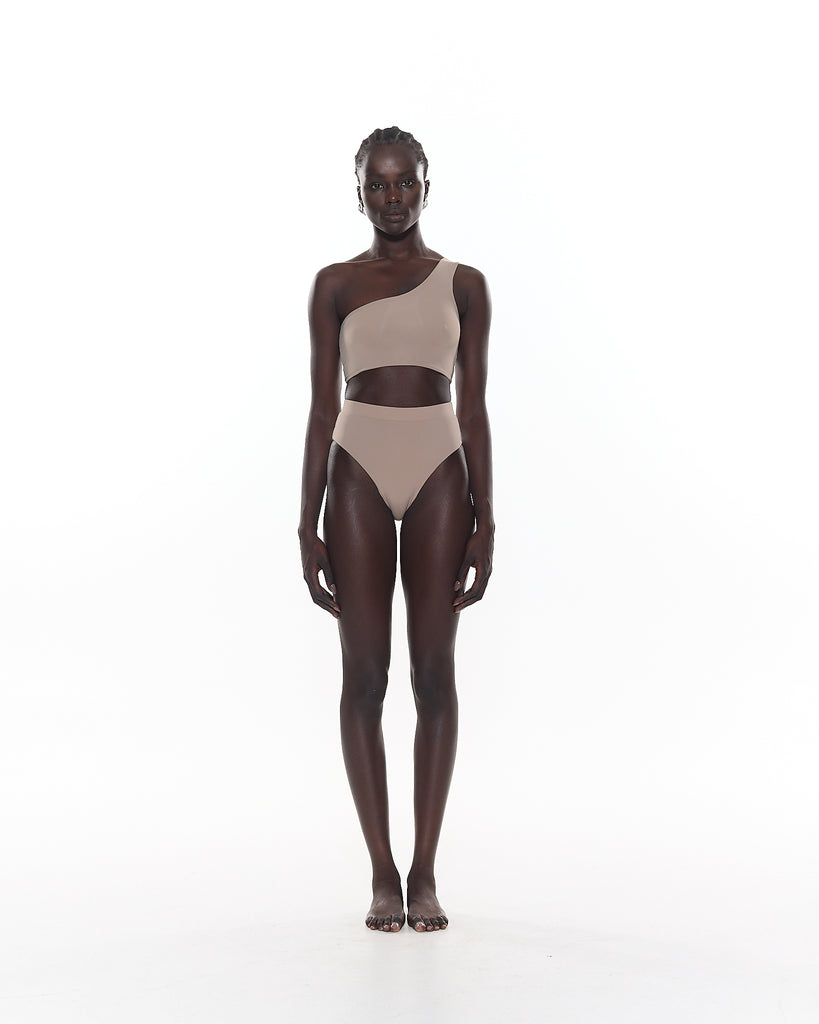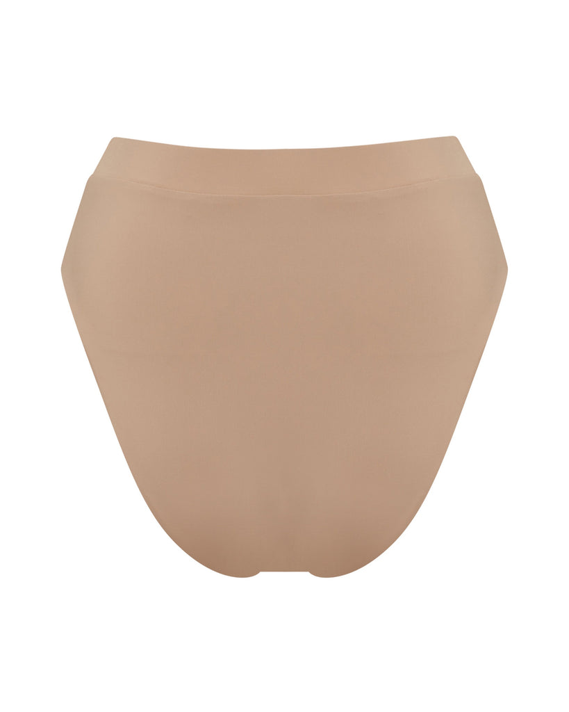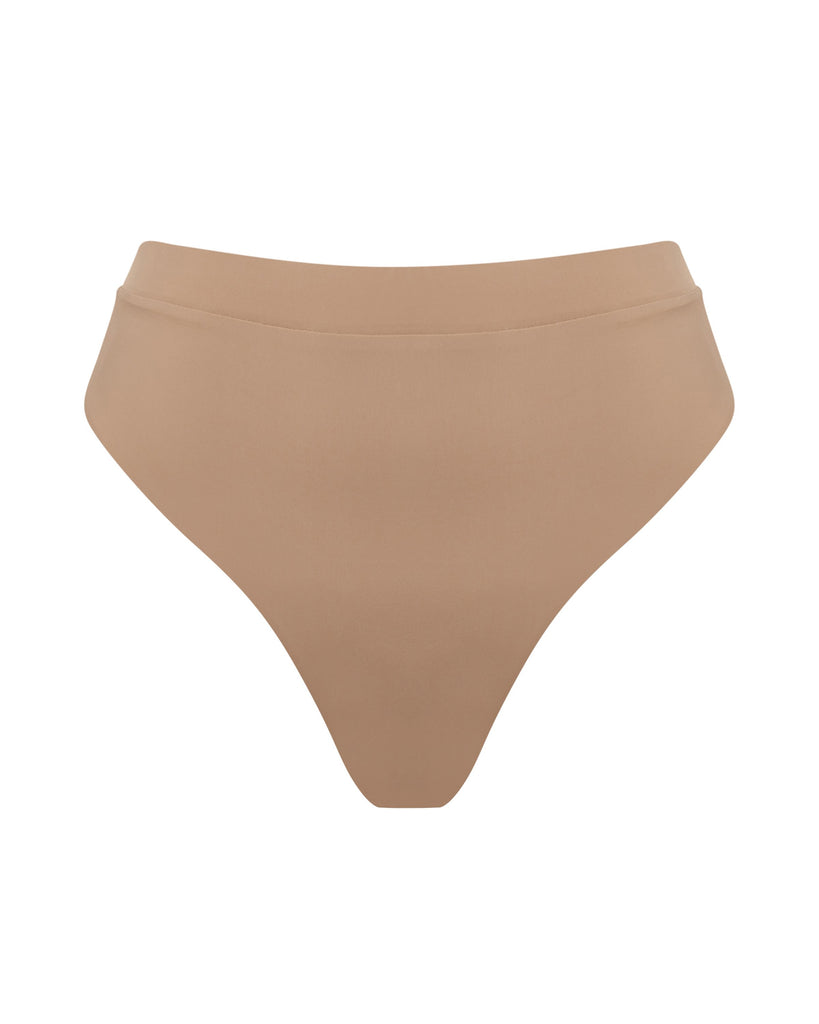 The Hugo High Waist Bikini Bottom features an elastic waistband and full coverage bottom.