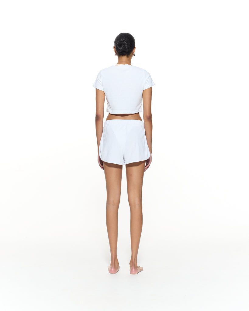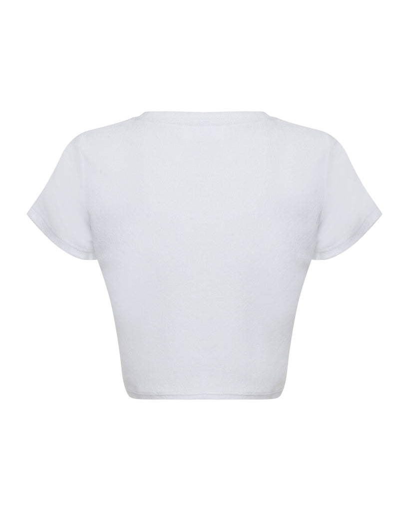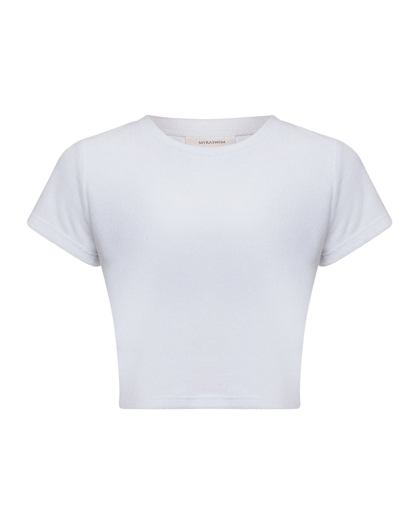 The Elvi Terry Towelling Baby Tee features a cap sleeve and cropped length.