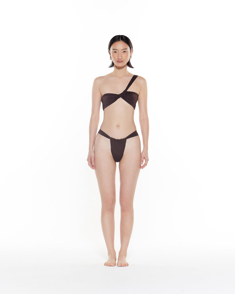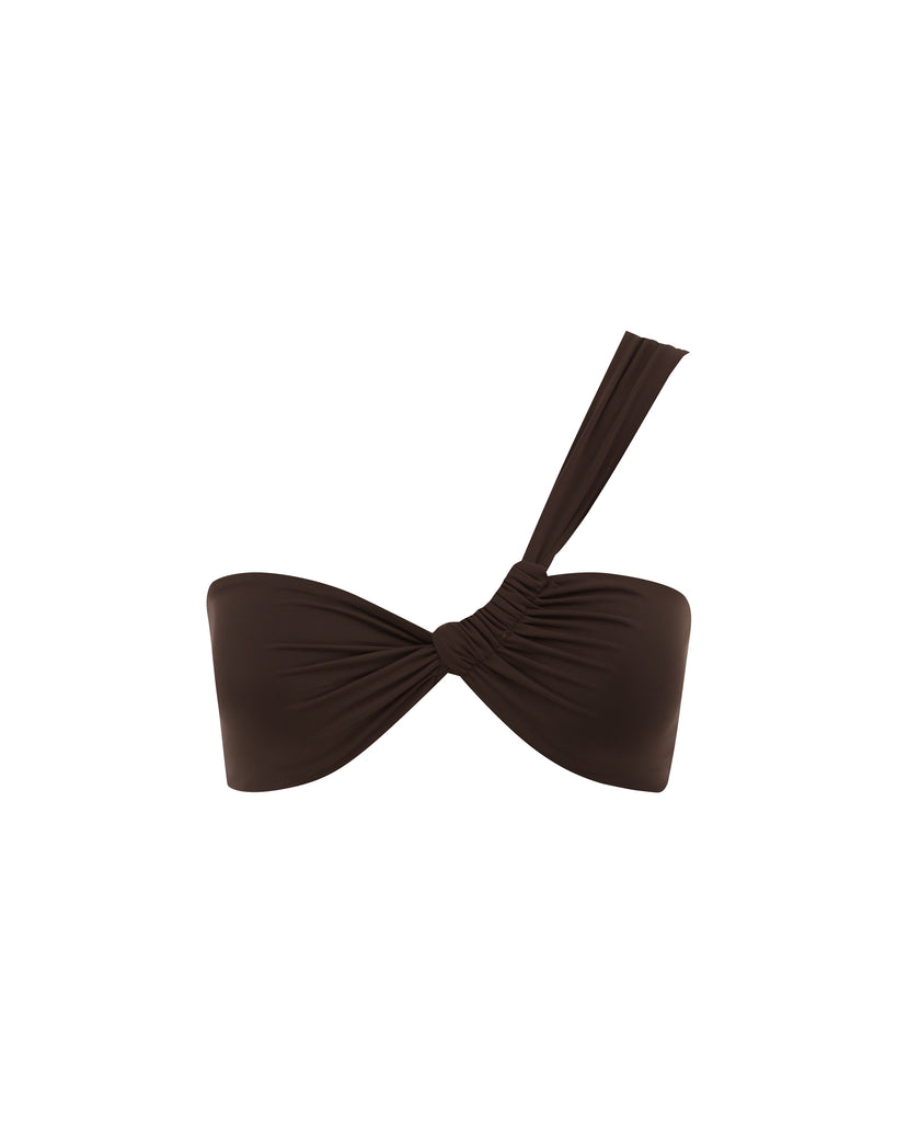The Enzo Asymmetric Ruched Bikini Top features a one-shoulder design and adjustable front twist detail.