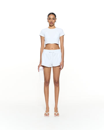 The Elvi Terry Towelling Baby Tee features a cap sleeve and cropped length.