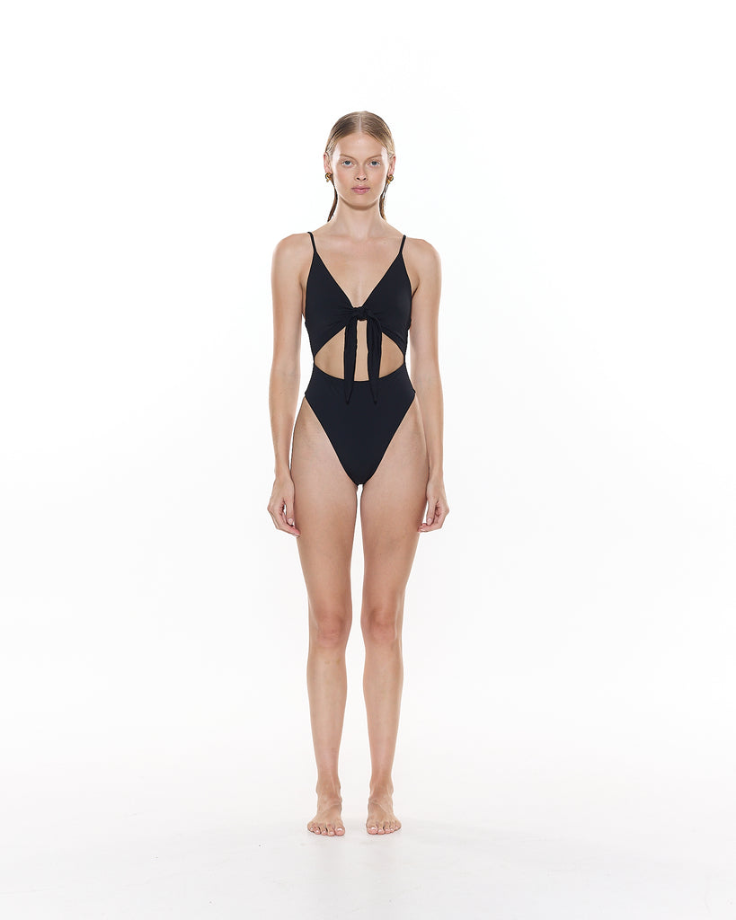 The Bracken Tie Front One Piece features a front cut out detail, thin adjustable shoulder straps and a mid coverage bottom.