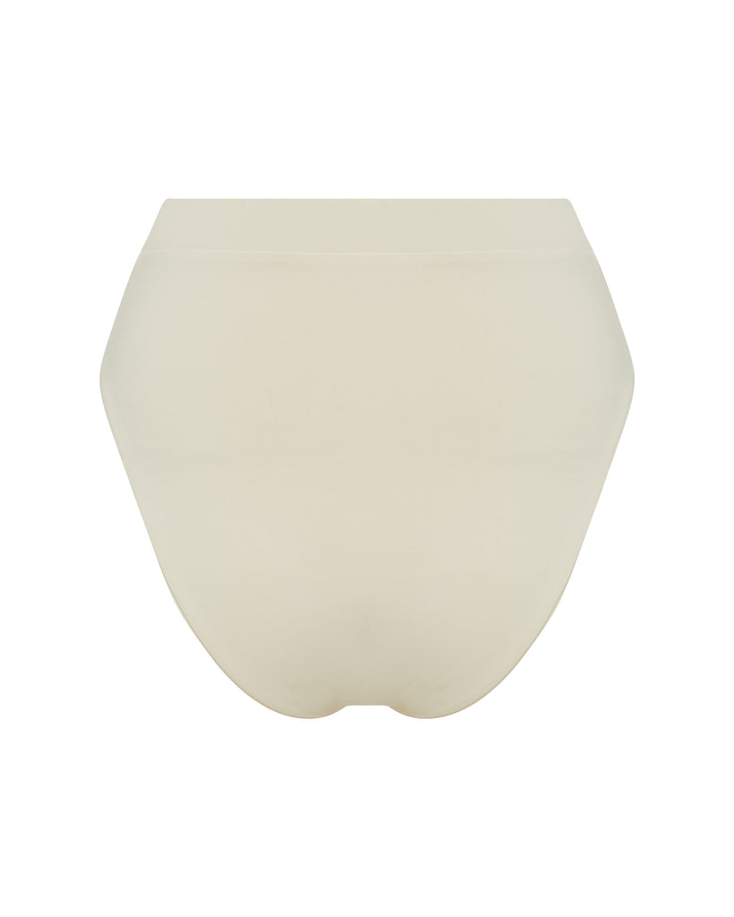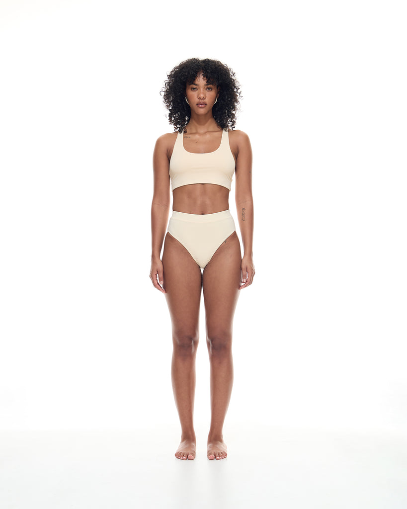 The Hugo High Waist Bikini Bottom features an elastic waistband and full coverage bottom.