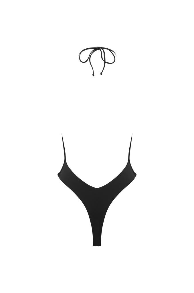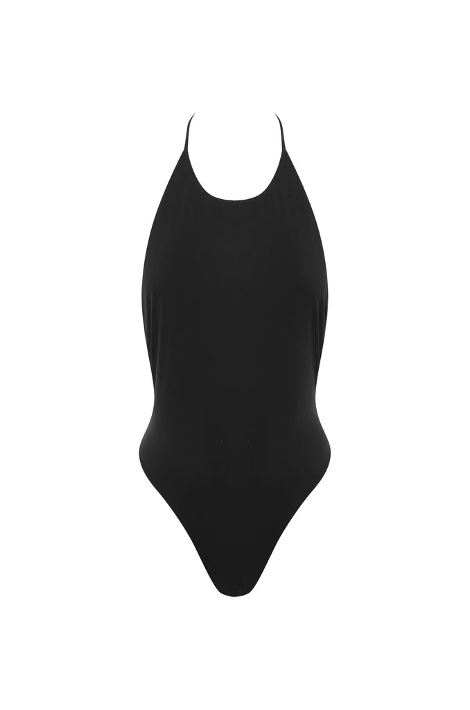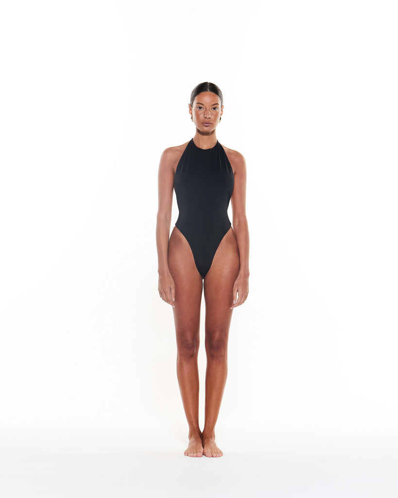The Porter High Neck One Piece features a halter neckline, open back and thong style bottom.