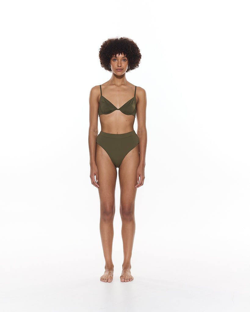 The Hugo High Waist Bikini Bottom features an elastic waistband and full coverage bottom.