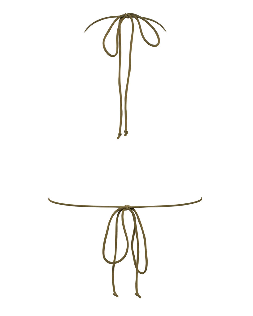The Sofia Triangle Bikini Top is a minimal coverage style featuring thin drawstring ties and adjustable triangle cups.