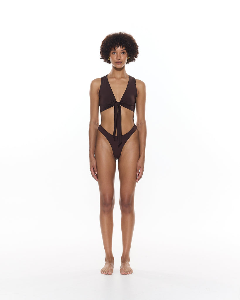 The West Tie-Front Bikini Top features a v-neckline and adjustable front tie detail.